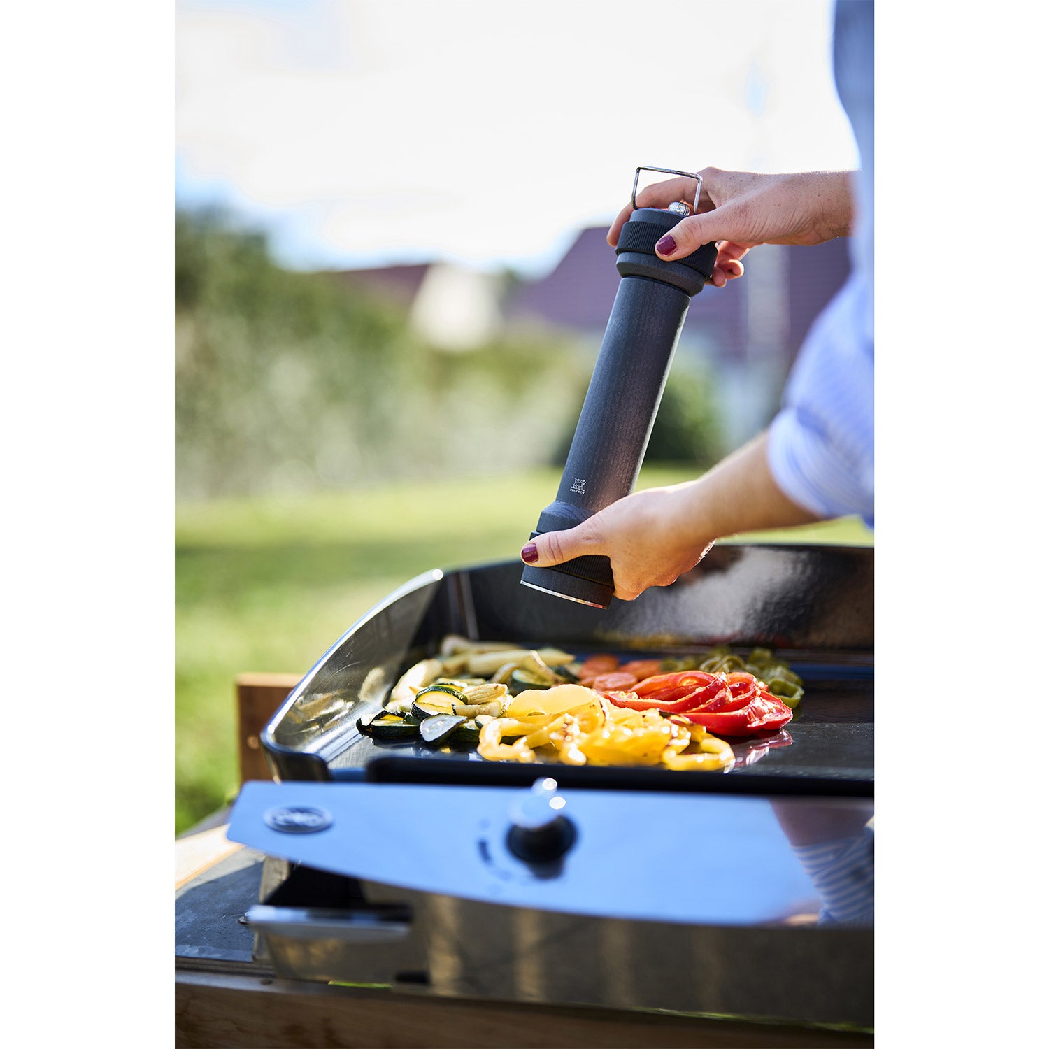 Die Pfeffermühle BBQ ist die erste manuelle Mühle von Peugeot mit automatischer Beleuchtung und ebenso praktisch wie innovativ. An ihrem Ring kann sie transportiert und am Grill aufgehängt werden, sodass sie leicht zu verstauen und jederzeit griffbereit ist. Die robuste Mühle BBQ ist dank ihrer Gummischutz-Verkleidung und des Edelstahlsockels stoßfest und für den Gebrauch im Freien geeignet. Ihr besonderes Highlight: Die LED-Beleuchtung wird automatisch durch eine Neigung der Mühle um 25° ausgelöst und verfügt über eine Lebensdauer von mindestens 20.000 Benutzungen, bevor die Batterie gewechselt werden muss. Nach dem Gebrauch erlischt das Licht sanft, sobald die Mühle wieder in die vertikale Position zurückgebracht wird. Sie sind Grillfan- Dann ist diese Mühle genau das Richtige für Sie
