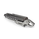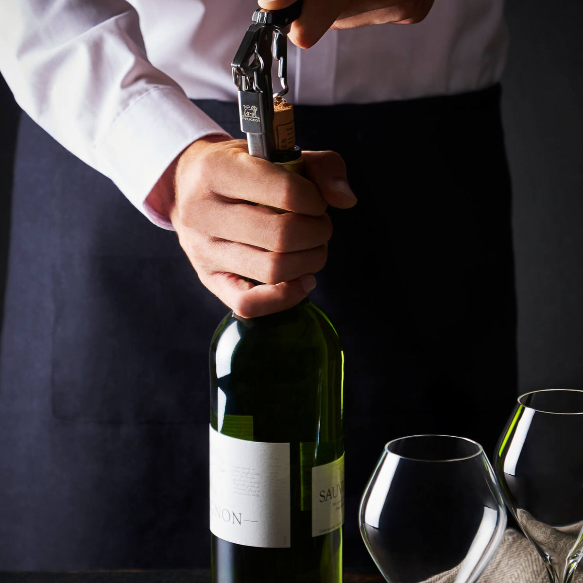 Der Korkenzieher „Clavelin“ von Peugeot mit patentiertem System öffnet die Flasche in einer Handbewegung. Sommeliermesser mit integriertem Kapselschneider und Flaschenöffner.