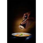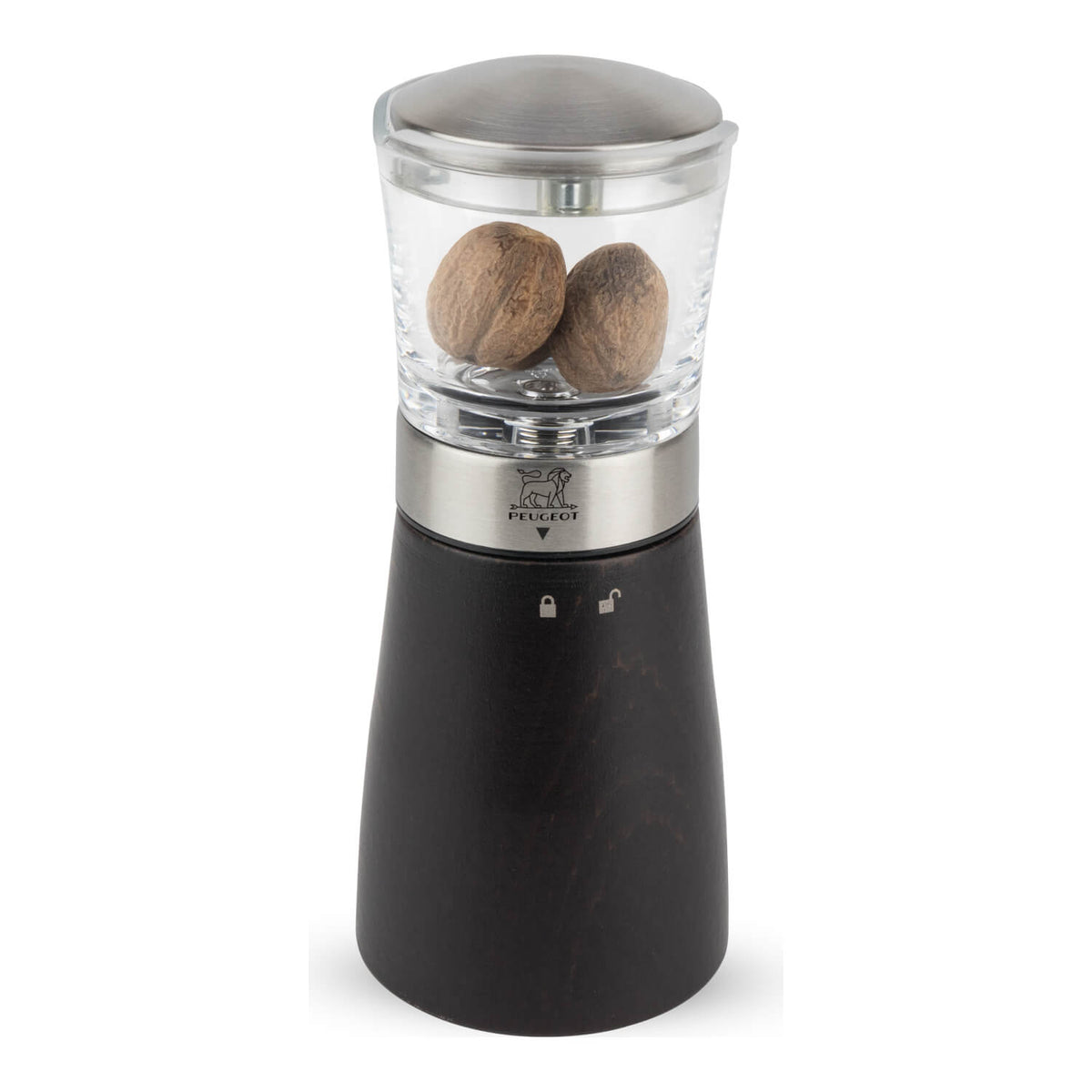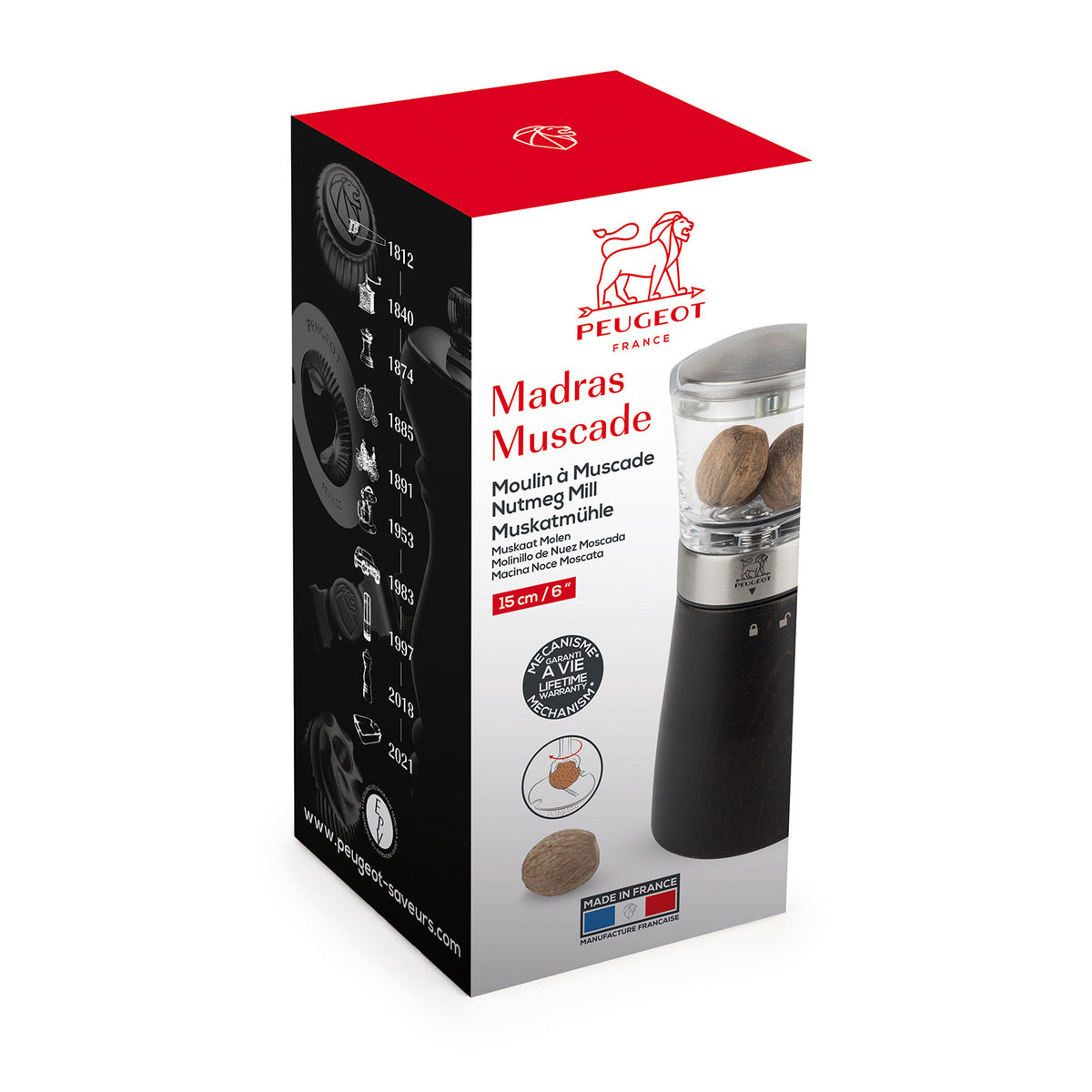 Meister- und Hobbyköche wissen es: Nichts geht über eine Prise frisch gemahlener Muskatnuss, um ein süßes oder salziges Gericht delikat zu verfeinern. Die Peugeot Muskatmühle „Madras“ ist das perfekte Hilfsmittel, um ganz einfach im Handumdrehen mit Muskatnuss zu würzen. Das ausgeklügelte Gerät weist eine kräftige Fixierung und eine simultan drehende Doppelschneide auf, der keine Muskatnuss widersteht. Praktisch und immer griffbereit, Ihre Finger werden es Ihnen danken. Im Handumdrehen wird die Nuss fein gemahlen und bringt ihr delikates Aroma zur Entfaltung. Das Gerät ist mit einem leicht zugänglichen Vorratsbehälter für 3 Muskatnüsse ausgestattet. Das Design verbindet die Modernität von Edelstahl und Acryl mit der Wärme des gedrechselten Holzes. Mit der dazugehörigen Pfeffer- und Salzmühle bieten sie ein unverzichtbares Trio.