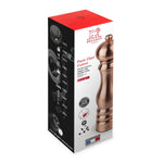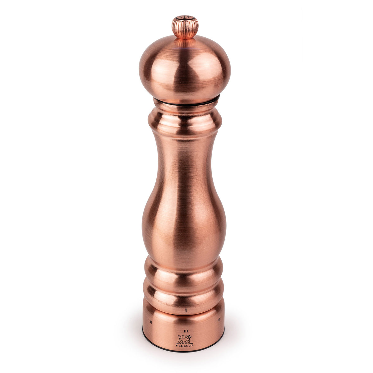 Die Mühlen der Paris-Serie sind das Vorzeigemodell der Marke Peugeot. Mit einer Höhe von 22 cm bietet die Pfeffermühle eine perfekte Ergonomie. Das maßgeschneiderte Mahlwerk wird von Köchen auf der ganzen Welt geschätzt. Ein grober Mahlgrad hebt die Aromen des Pfeffers hervor, während ein feiner Mahlgrad seinen scharfen Charakter besser zur Geltung bringt. In dieser Ausführung ist der Mühlen-Körper aus rostfreiem Stahl mit einer schützenden Kupferschicht überzogen. In vollen Zügen zu genießen, in der Küche oder auf dem Tisch!