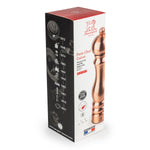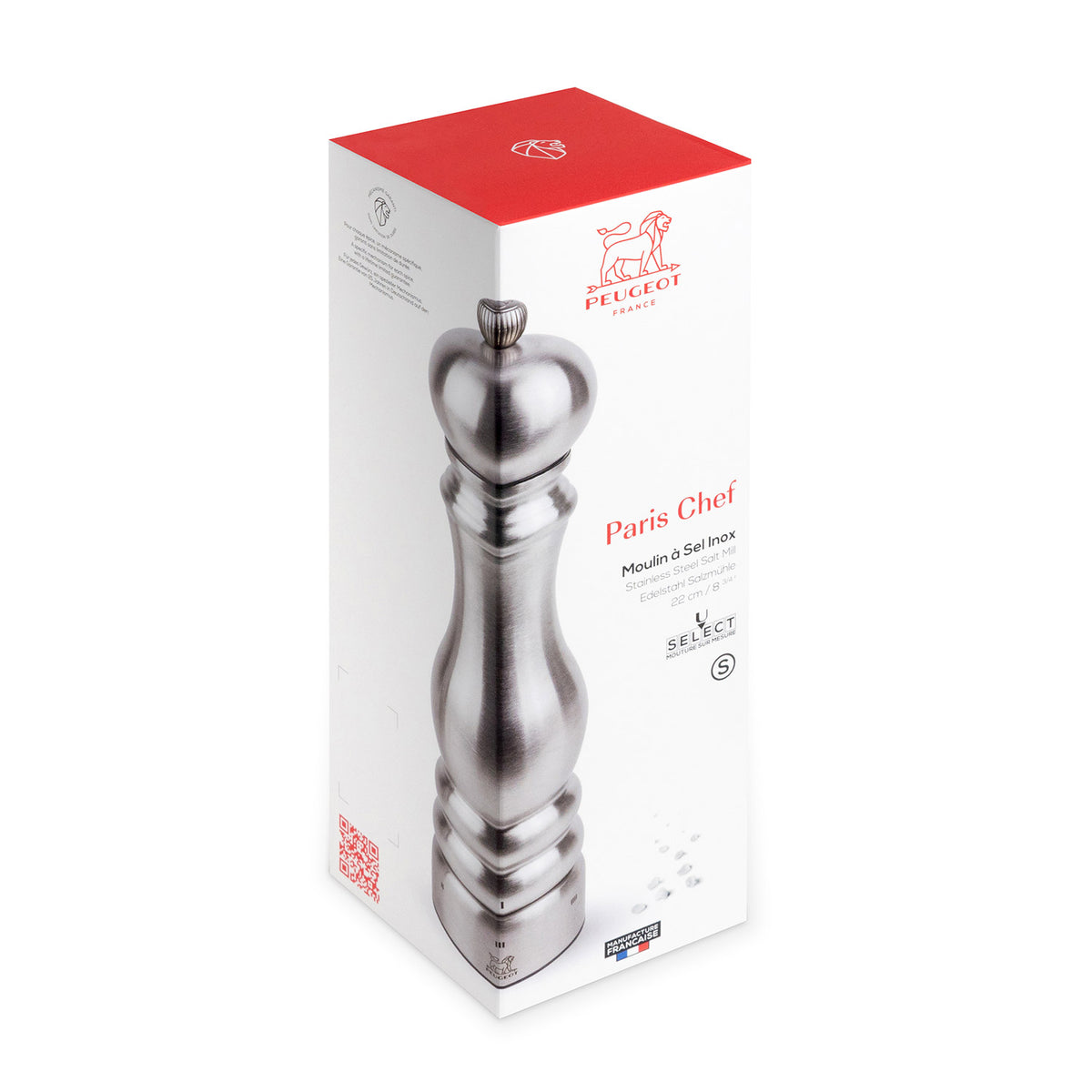 Die 22 cm große Peugeot Salzmühle der Paris Chef Kollektion ist die Mühle der anspruchsvollen Hobbyköche. Sie übernimmt in einer Edelstahlverarbeitung die Silhouette der vor mehr als 30 Jahren geschaffenen legendären Parismühle. Der für die Fertigung dieser Mühle verwendete Edelstahl ist ein hochwertiges Material, das stets eine ausgezeichnete Widerstandsfähigkeit gewährleistet. Wie alle Peugeot-Mühlen ist diese Salzmühle mit dem Peugeot-Mahlwerk aus Stahl ausgestattet, auf das in Deutschland eine 25-jährige Garantie gewährt wird. Die Mahlgradregulierung ermöglicht eine Wahl von sechs verschiedenen Salzmahlgrößen. Sie können zum Beispiel einen feinen Mahlgrad wählen, um Ihre Salate zu würzen, und einen gröberen Mahlgrad, um Ihr Fleisch noch schmackhafter zu machen.