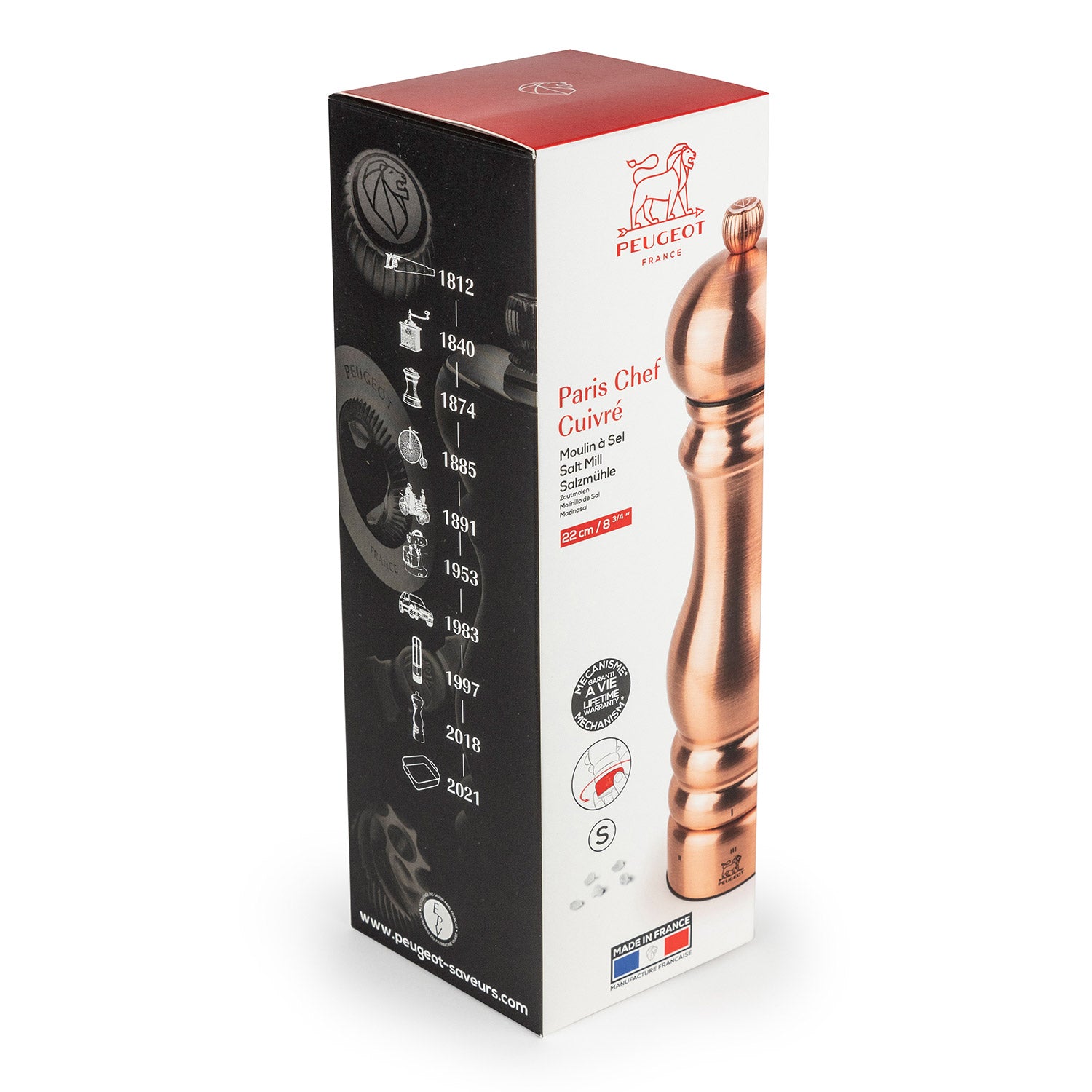 Peugeot zählt zu den bekanntesten französischen Marken, die in der kollektiven Vorstellungswelt einen festen Platz haben. Als Zeugen einer großen VErgangenheit sind Peugeot Mühlen von den Tischen der größten Küchenchefs nicht wegzudenken. Das Abenteuer Peugeot begann im 19. Jahrhundert. Sägeblätter, Kaffeemühlen, Reifröcke, Tischmühlen, Hochräder ... mit ihren genialen Erfindungen steht die Marke seit jeher an der Spitze der Ingenieurskunst und Innovation! Im Laufe der Jahre hat sich die Marke diversifiziert und umfasst heute mehrere Produktreihen.