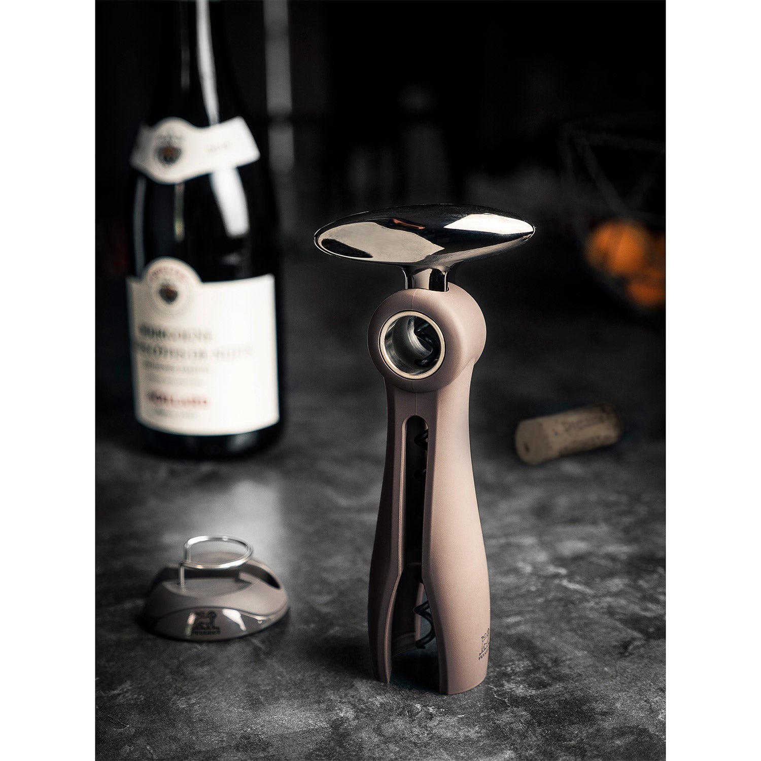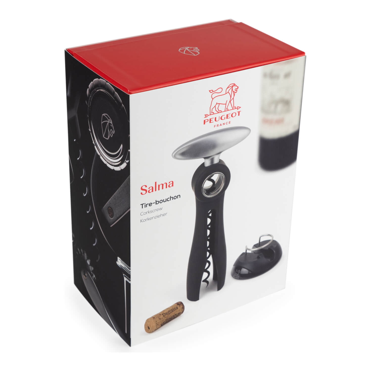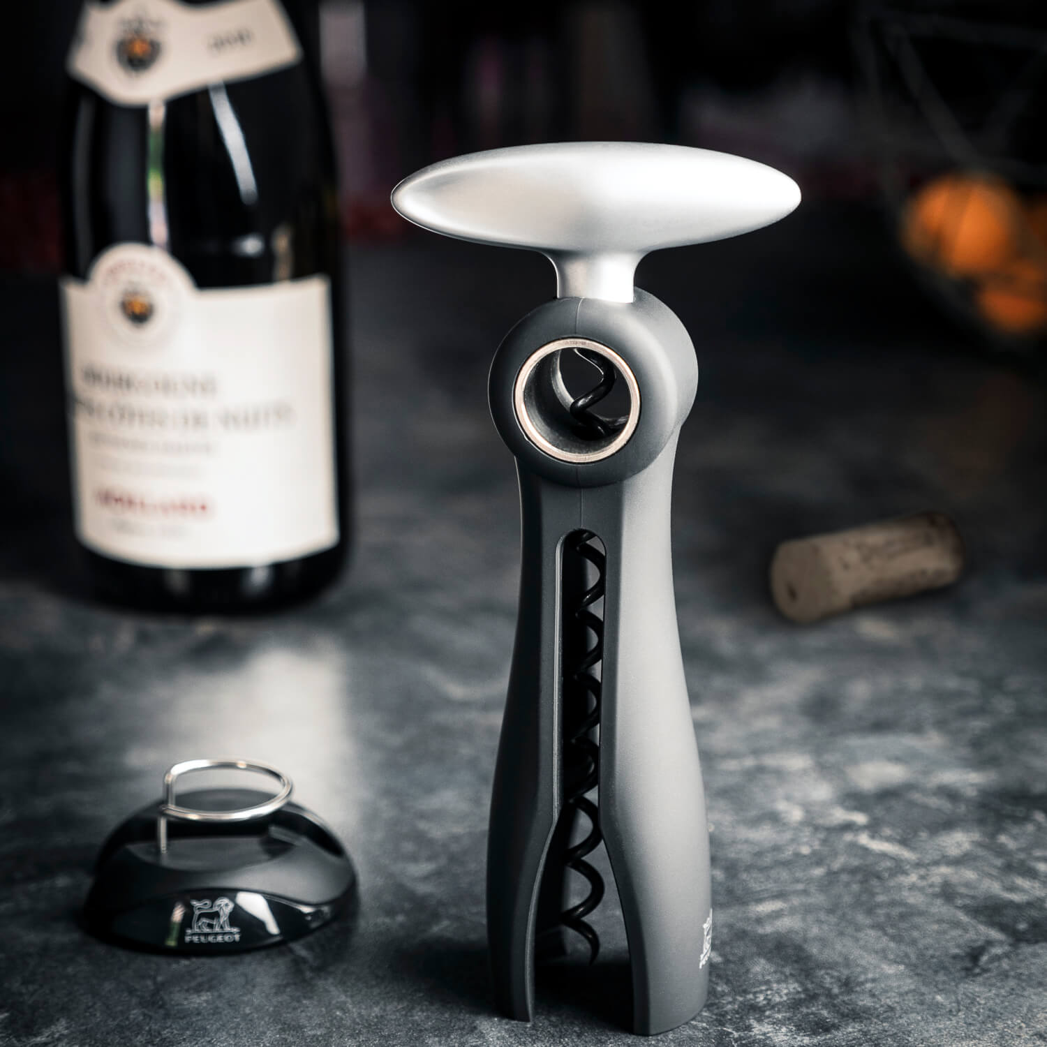 Der basaltfarbene Korkenzieher „Salma“ von Peugeot ist mit einer Spindel ausgestattet, die alle Flaschen mit einer Handbewegung öffnet. Das ausgeklügelte Unterteil des Spindelkorkenziehers dient auch als Kapselschneider.