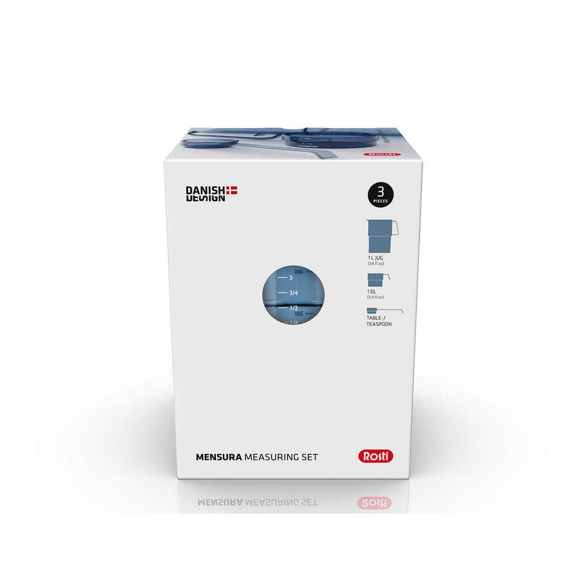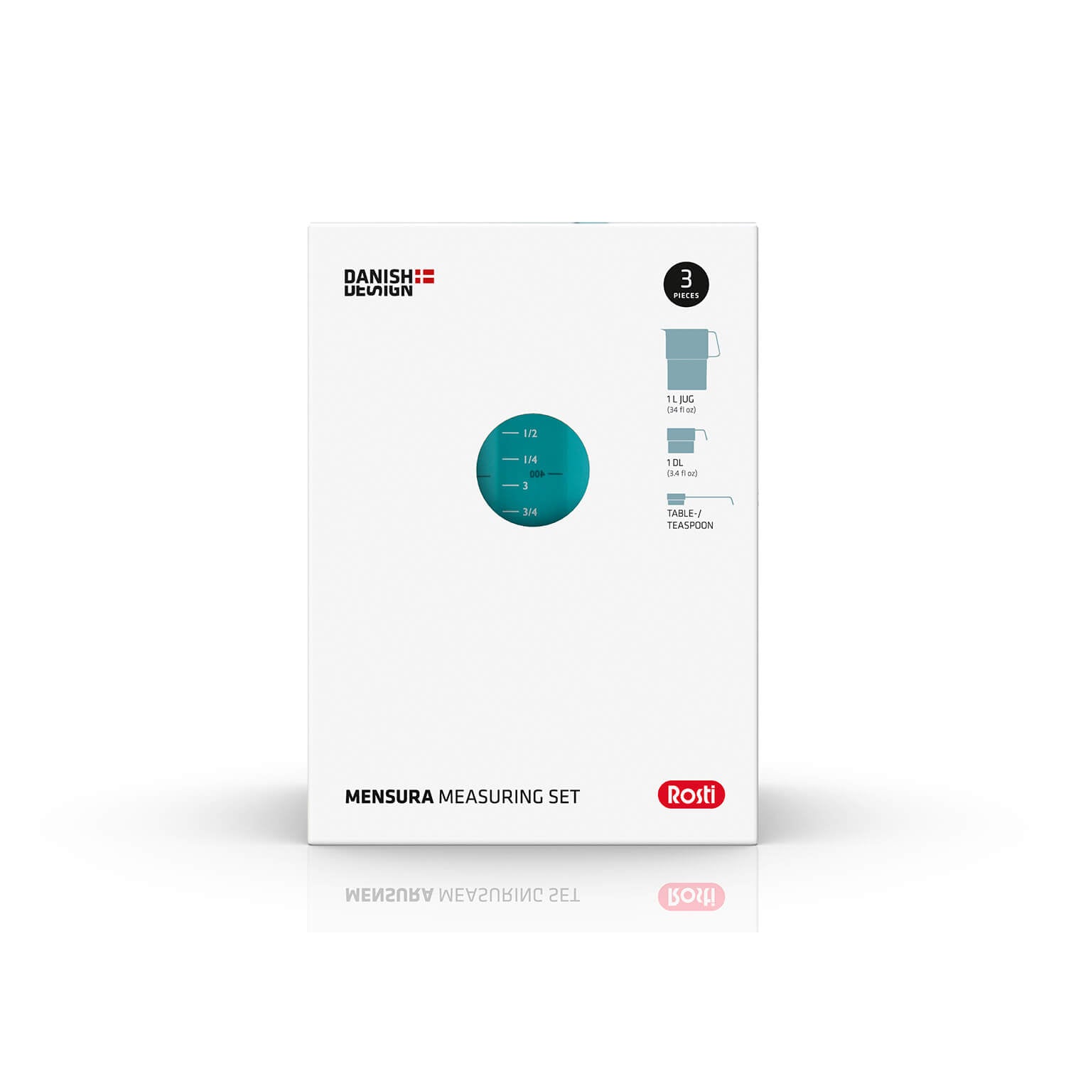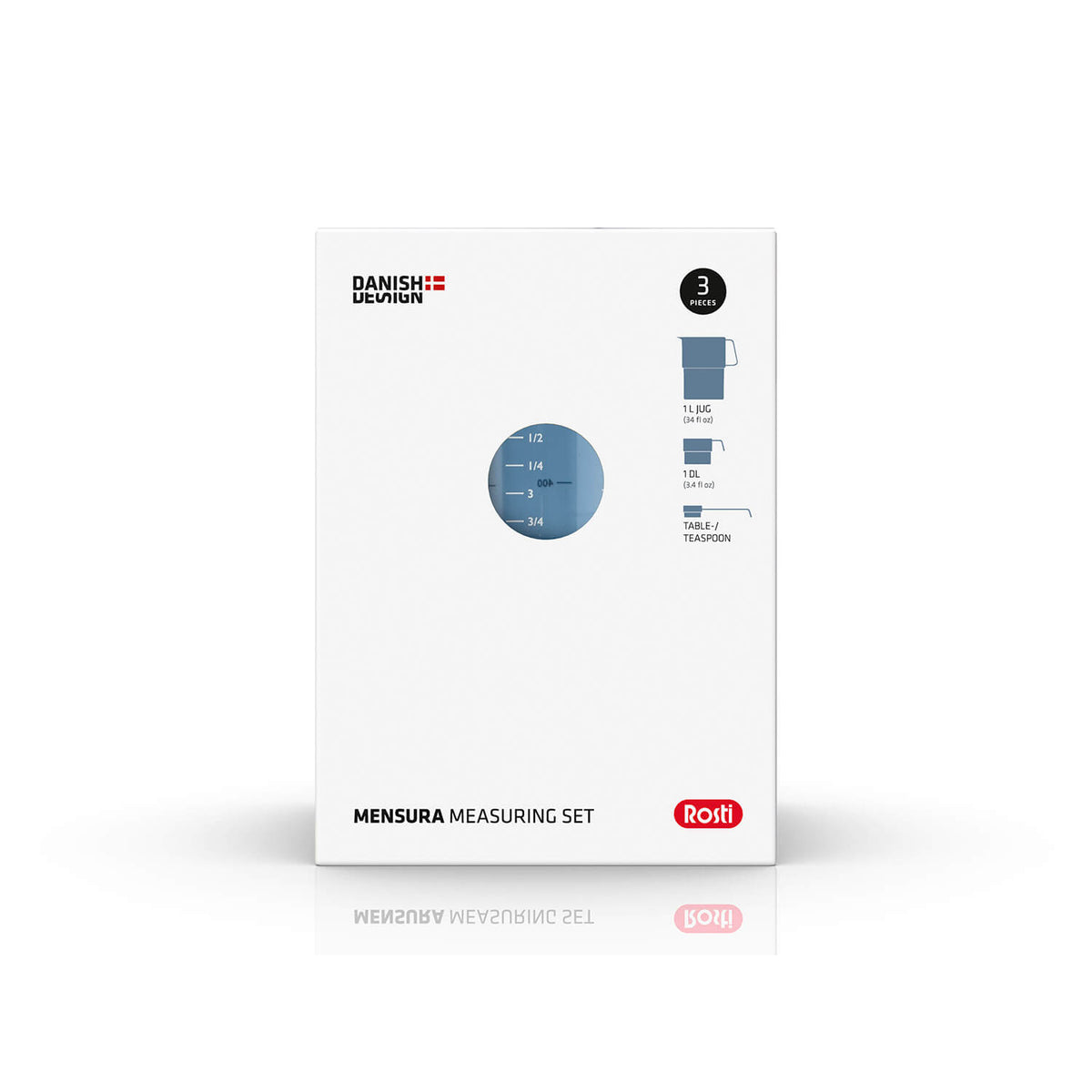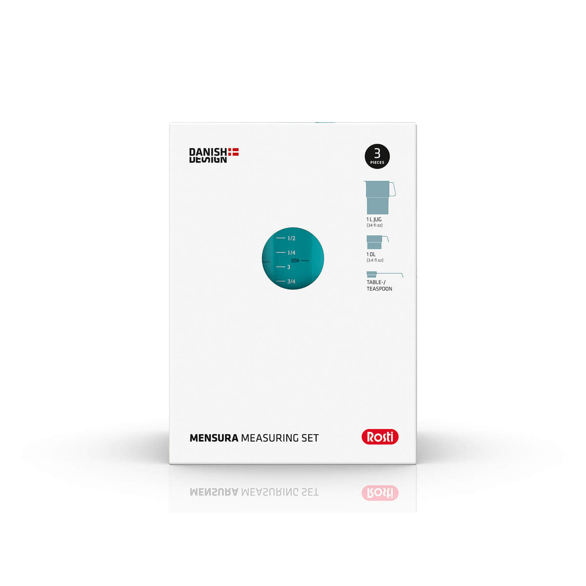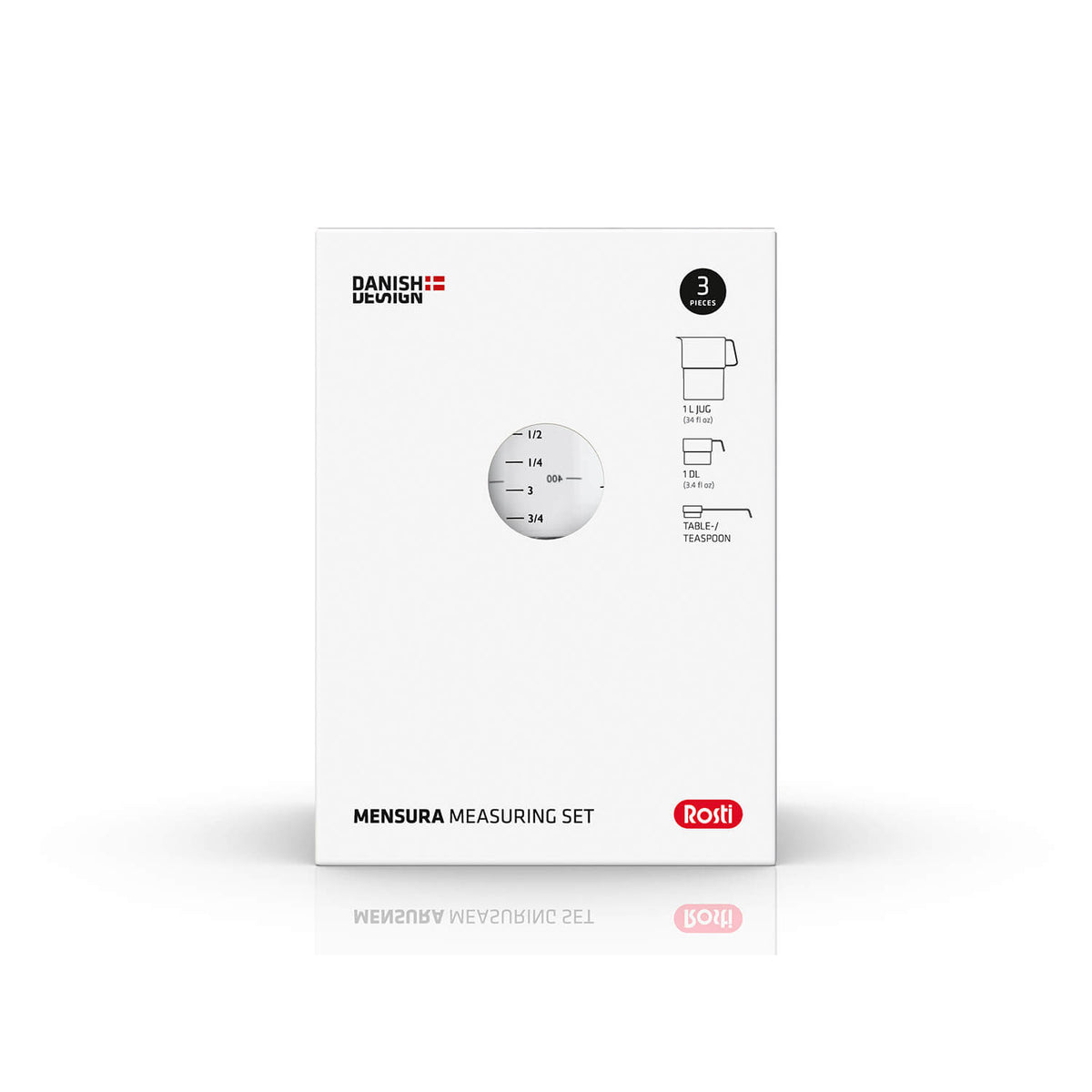 Die Produkte sind mit einer Markierung in der Mitte gestaltet, die in einen Teelöffel/Esslöffel beim Messlöffel, einen halben/ganzen Deziliter beim Messbecher und einen halben/ganzen Liter bei der Messkanne unterteilt. Als etwas absolutes Einzigartiges verträgt die Mensura Messkanne kochendes Wasser und verfügt außerdem über Messindikatoren für ml, Tassen und fl oz sowie für Mehl, Reis und Zucker.