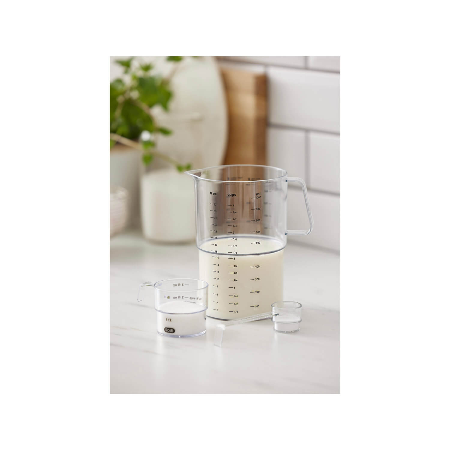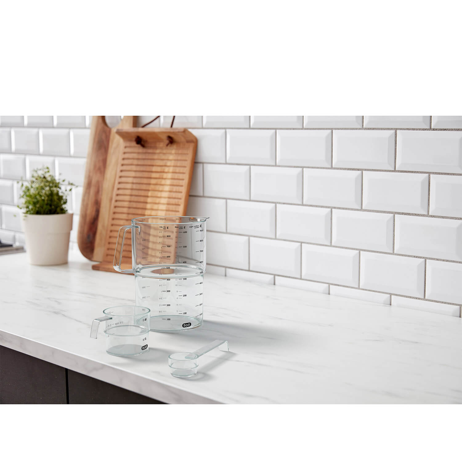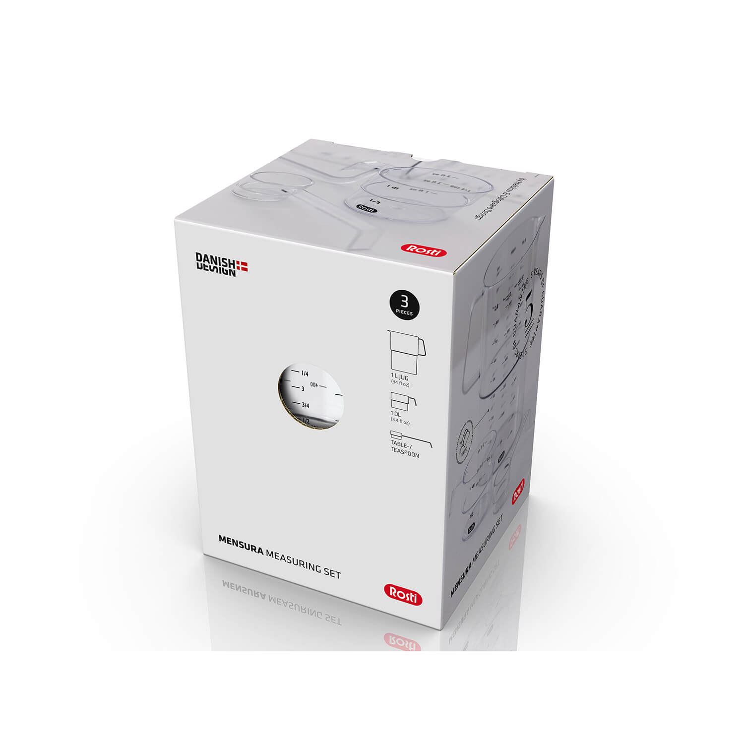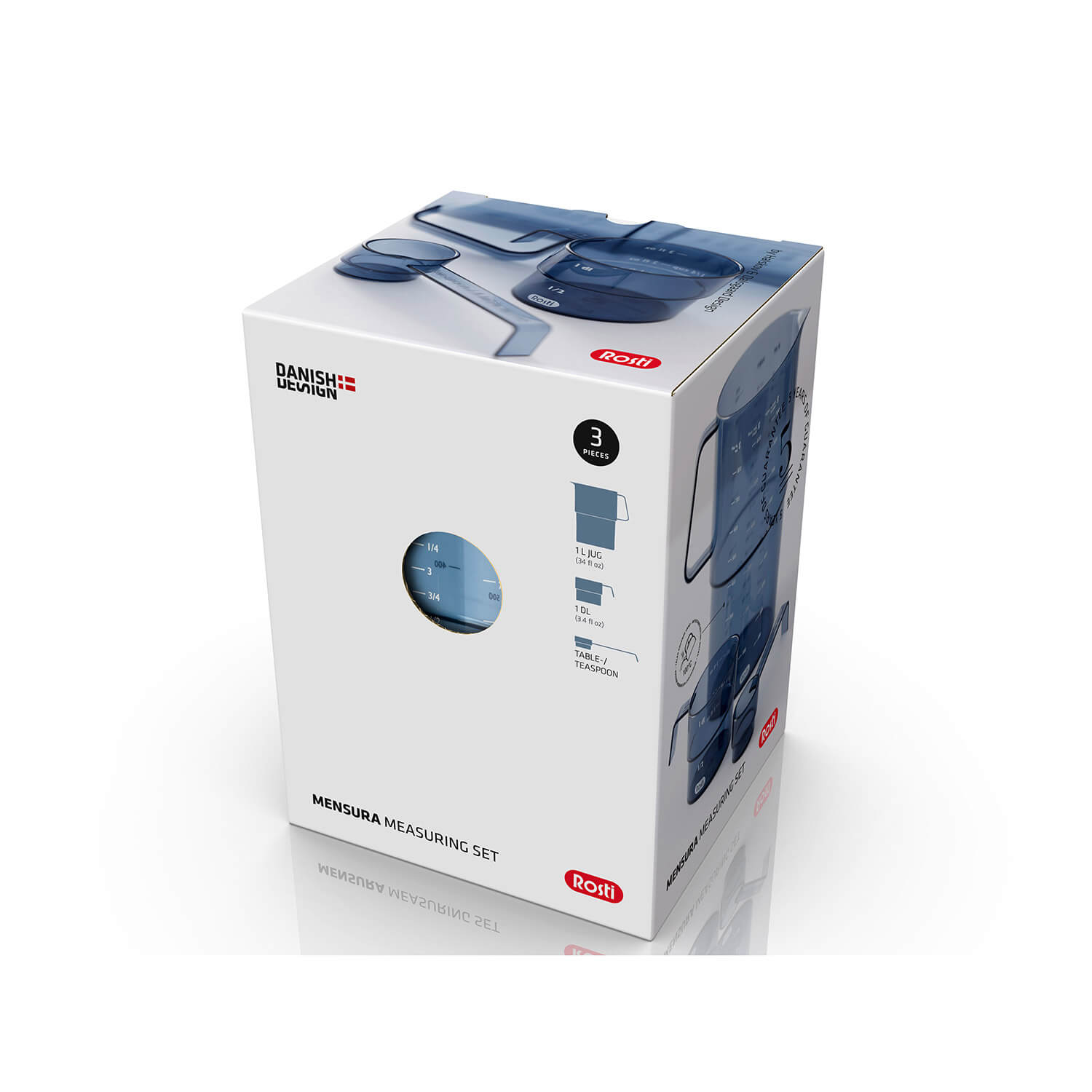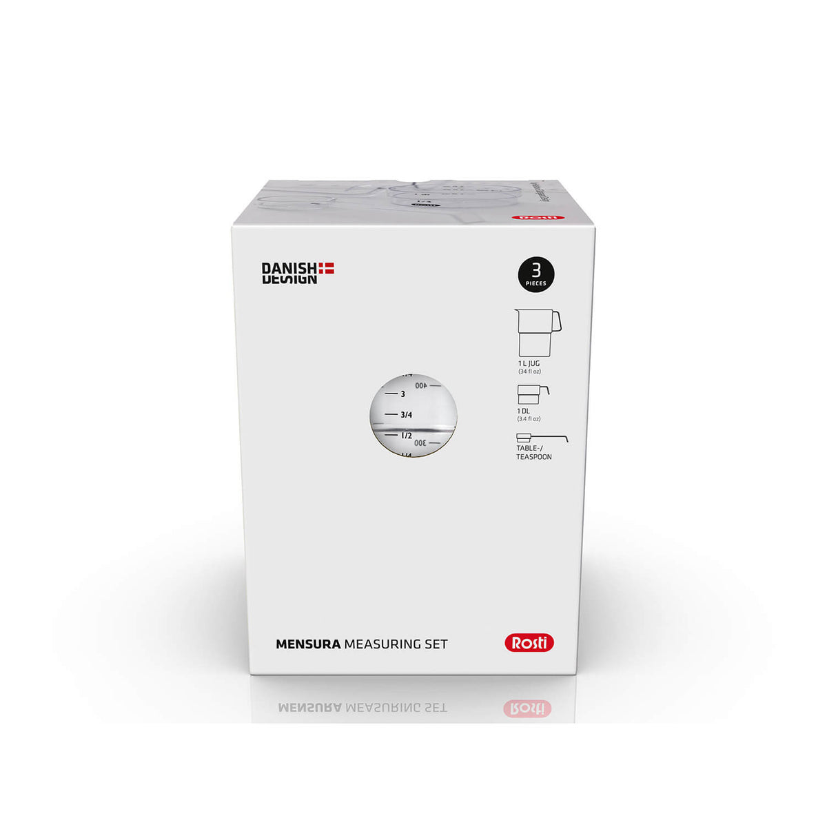 Die Produkte sind mit einer Markierung in der Mitte gestaltet, die in einen Teelöffel/Esslöffel beim Messlöffel, einen halben/ganzen Deziliter beim Messbecher und einen halben/ganzen Liter bei der Messkanne unterteilt. Als etwas absolutes Einzigartiges verträgt die Mensura Messkanne kochendes Wasser und verfügt außerdem über Messindikatoren für ml, Tassen und fl oz sowie für Mehl, Reis und Zucker.