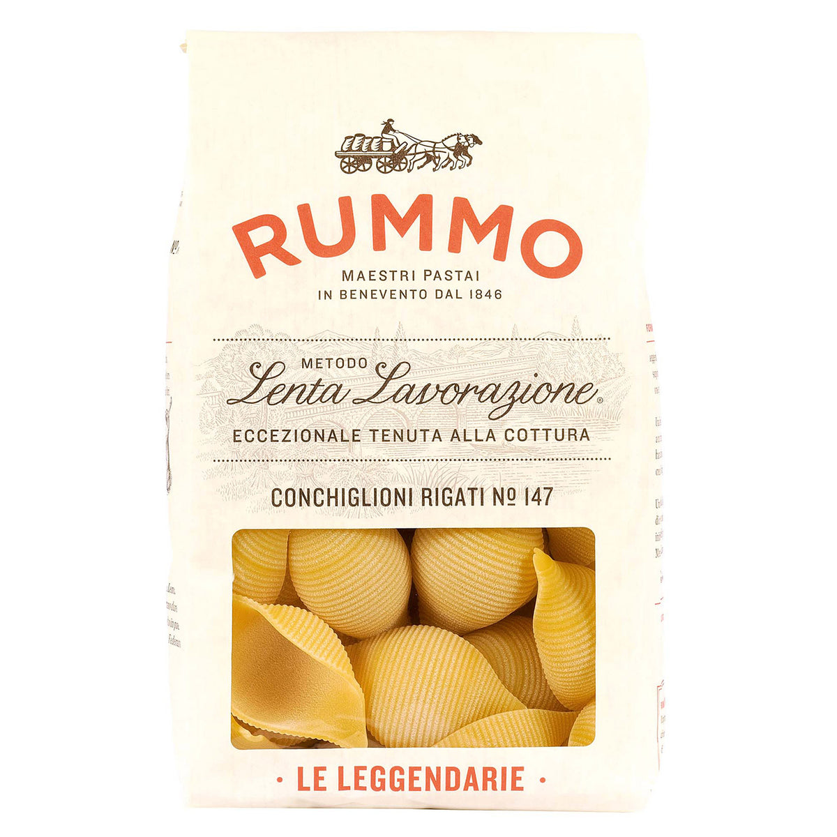 Rummo Conchiglioni Rigati - traditonelle Pasta in der 500 g Packung aus dem Süden Italiens, die gern gefüllt wird, beispielsweise als Pasta alla Norma mit Ricotta und Auberginenwürfelchen. Man kann sie gefüllt auch im Ofen mit Bolognesesugo und Käse überbacken. Die Kochzeit beträgt ca. 12 Minuten.
