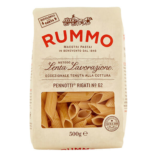 Die Rummo Pennotti Rigati N° 62 sind kleine, gerillte Röhrennudeln, die in der italienischen Küche zu den echten Allroundern zählen. Gefertigt aus bestem Hartweizengrieß und mit der unvergleichlichen Rummo-Tradition hergestellt, verbinden sie ursprüngliche Handwerkskunst mit modernem Genuss. Ihre feine, leicht verkürzte Form liegt perfekt auf der Gabel, während die Rillen jede Sauce umschmeicheln – ob samtige Käsesauce, aromatischer Tomatensugo oder kräftiges Ragù. Durch die langsame Trocknung bleibt das volle Aroma des Hartweizens erhalten, während die Konsistenz angenehm bissfest ist.