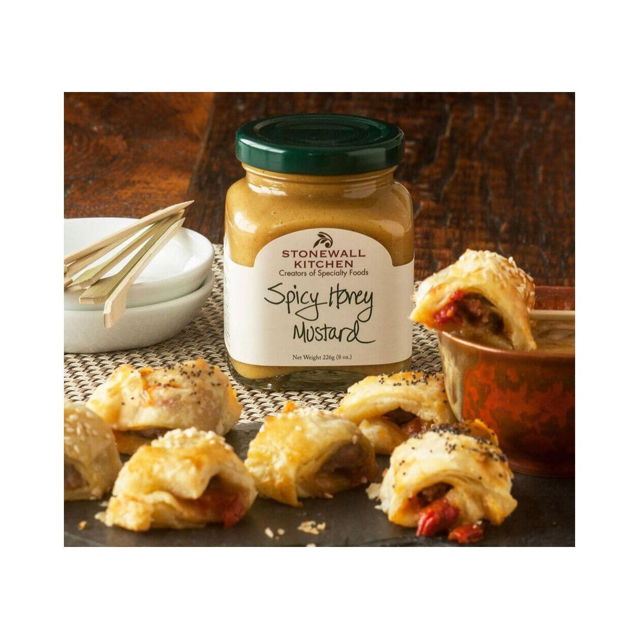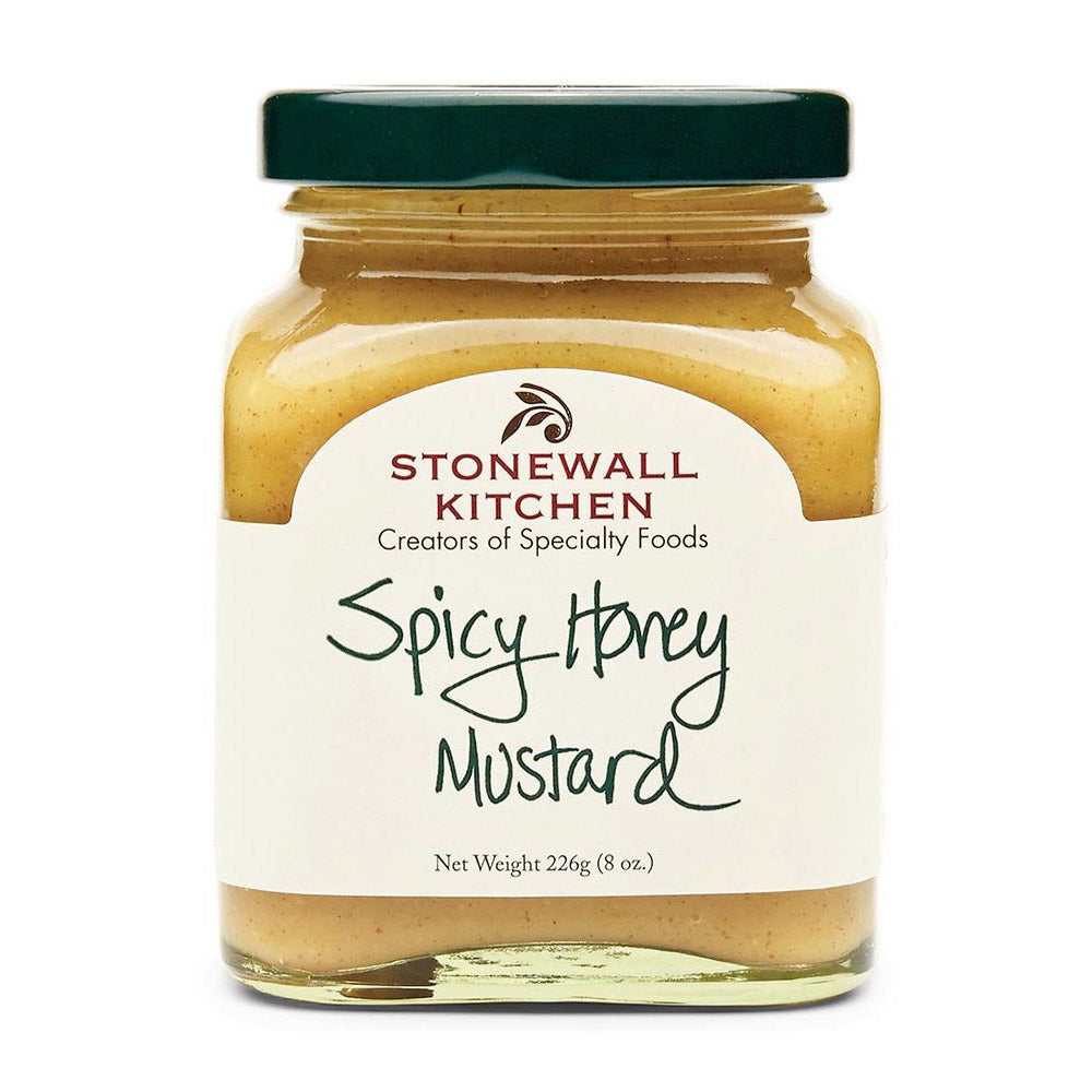 Spicy Honey Mustard - Honig-Senf als scharfe Variante von Stonewall Kitchen für alle, die es ein wenig schärfer mögen. Genießen Sie den scharfen Senf mit Honig zu Hühnchen, vor allem Chicken Wings, Pommes Frites und als Alternative zu regulärem Senf in allerlei Rezepten sowie als Brezel-Dip.