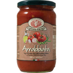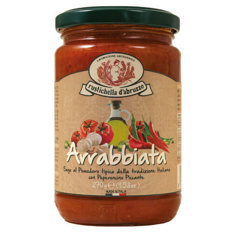 Der Sugo wird durch langsames Kochen von Tomatenmark, nativem Olivenöl extra aus dem Gebiet Aprutino Pescarese, Chilischoten, Knoblauch, Zwiebeln und Salz zubereitet und ist ein Klassiker der römischen und lateinischen Küche mit einem würzigen Geschmack. Dazu passt eine der bekanntesten Kurznudelformen der Welt, die Penne rigate, in den Varianten "traditioneller Hartweizengrieß" oder "Vollkorn" von Rustichella dAbruzzo.