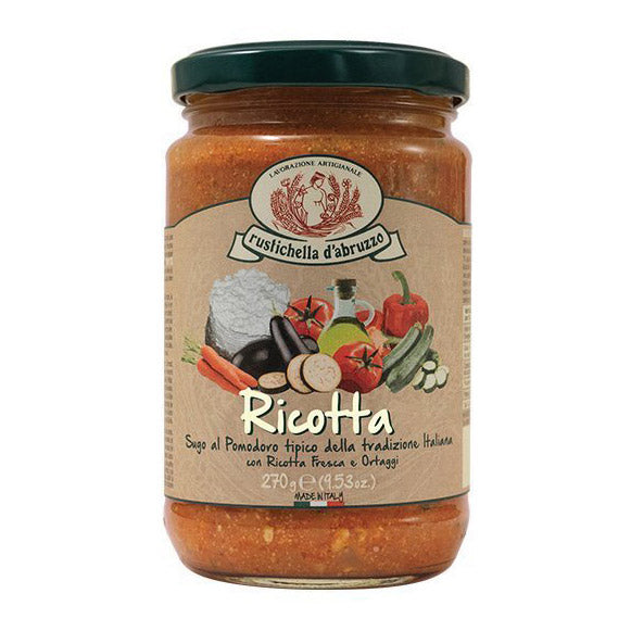 Gebrauchsfertiger Sugo aus gekochtem Tomatenmark, typisch für die italienische Tradition, mit frischem Ricotta-Käse, Gemüse und nativem Olivenöl extra aus der Region Aprutino Pescarese. Er passt besonders gut zu Farfalloni und Cannolicchi Rustichella dAbruzzo. Bei Raumtemperatur konsumieren oder bei schwacher Hitze leicht erwärmen. Nach dem Öffnen im Kühlschrank aufbewahren und innerhalb von 3-4 Tagen verbrauchen. Menge für 2-3 Personen.