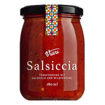 Dieses exklusive Tomatensugo wird mit hochwertiger Salsiccia gewürzt mit Wildfenchel und Lorbeer, zubereitet. Der Geschmack des schwarzen sizilianischen Schweins, das von den Griechen eingeführt wurde und die italienische Küche seit Jahrhunderten bereichert, verleiht diesem Sugo eine einzigartige Tiefe.