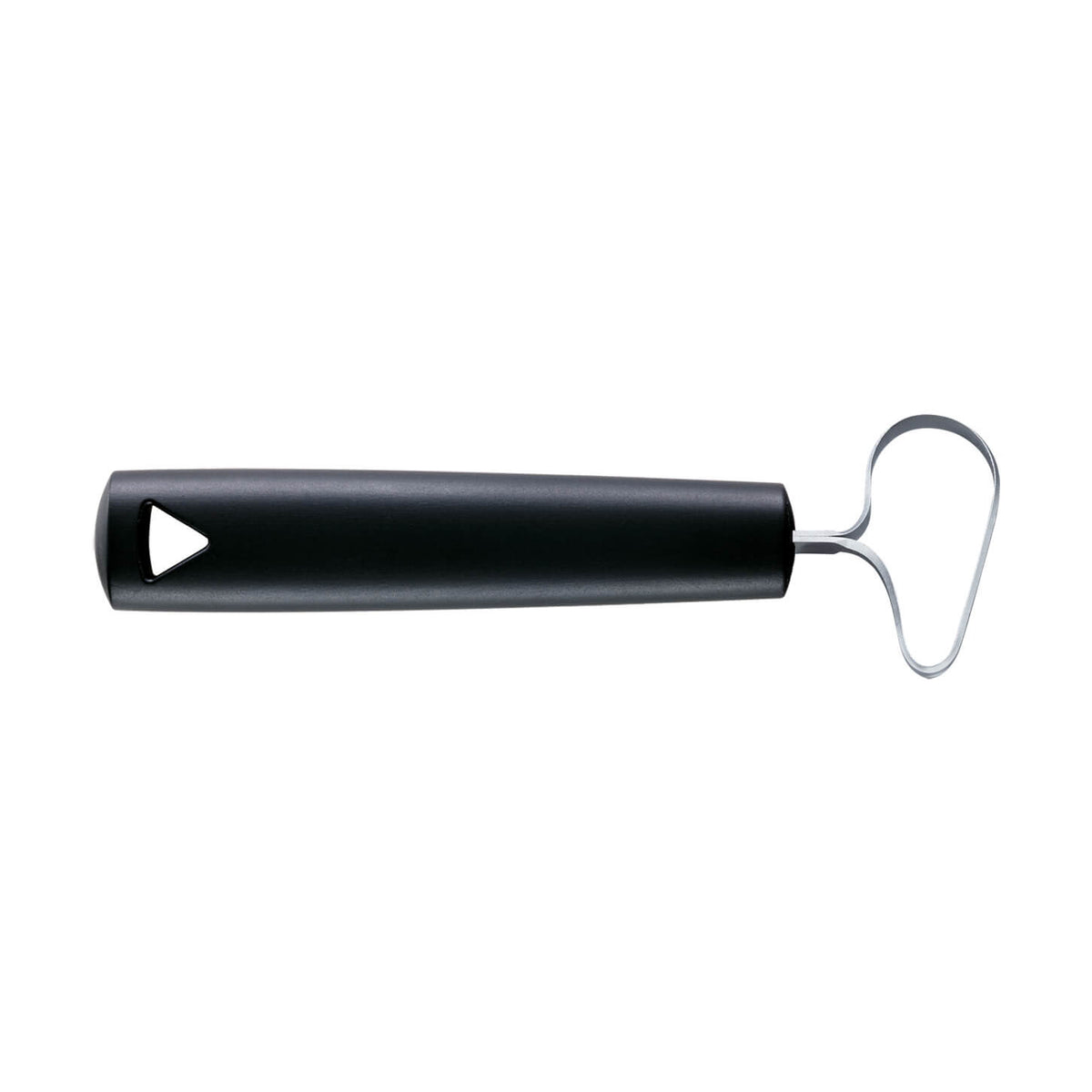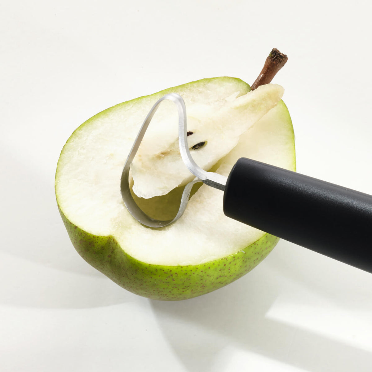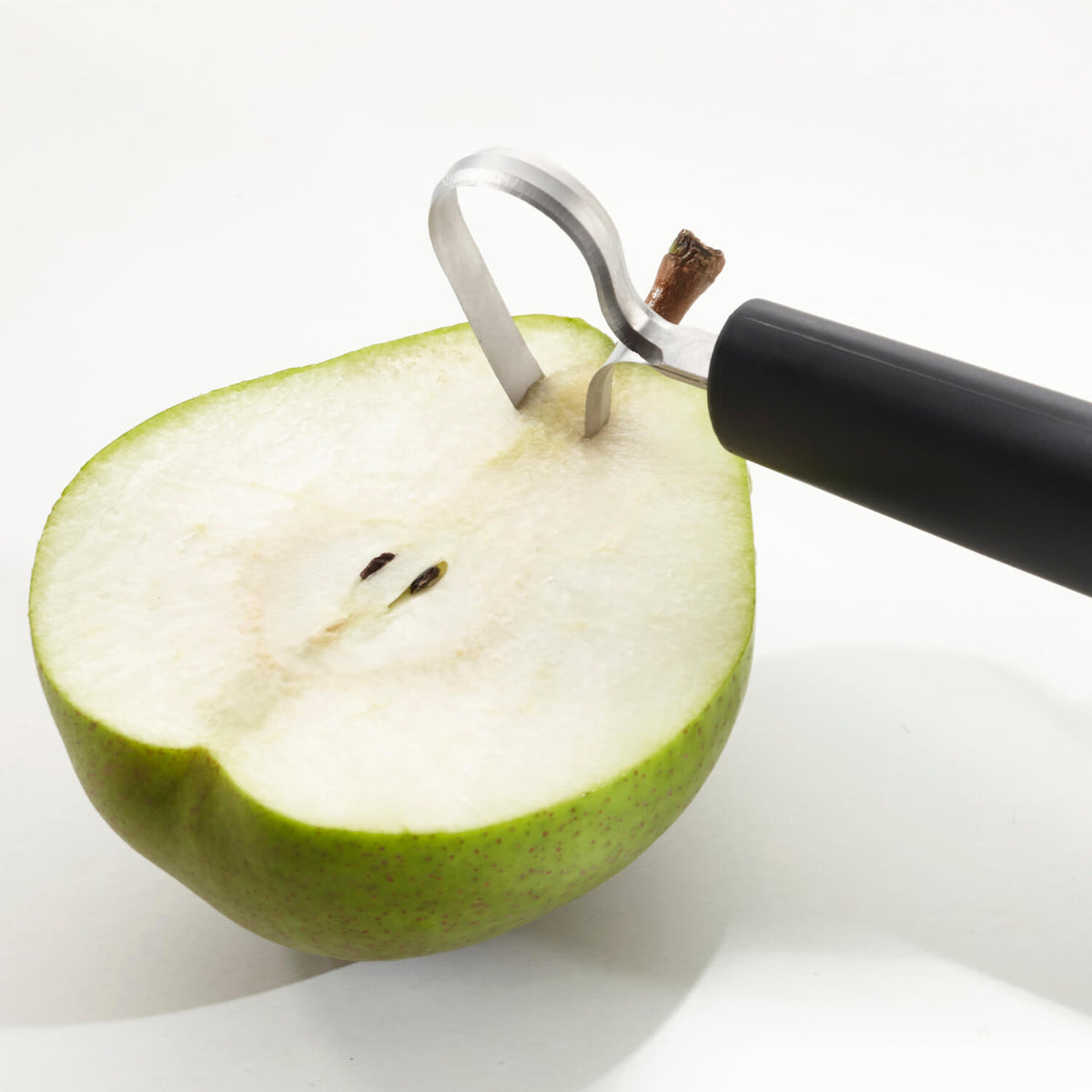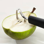 Mit dem Entkerner für Obst und Gemüse lassen sich schnell und einfach unterschiedlich große Kerngehäuse entfernen oder Fruchtfleich aushöhlen. Die Schlaufe aus rostfreiem Stahl ist beidseitig rundherum geschärft und kann so in verschiedenen Breiten genutzt werden: Die schmale Spitze für schmale Kerngehäuse, die breiteren Enden für größere Gemüse.