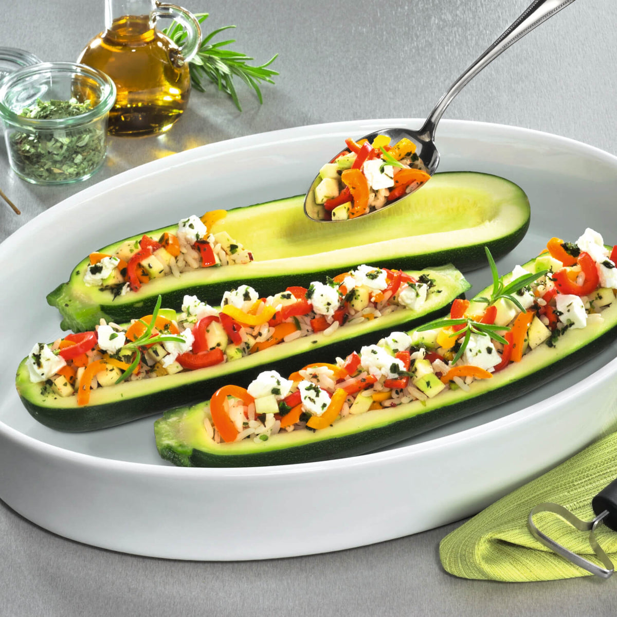 Der Entkerner gleitet einfach durch das Fruchtfleisch von Birnen, Auberginen, Zucchini, Kartoffeln, Gurke etc. und hinterläßt sauber geschnittene Rundungen – perfekt zum Füllen und Weiterverarbeiten. Zum Beispiel zu leckerer Aubergine gefüllt mit Caponata.