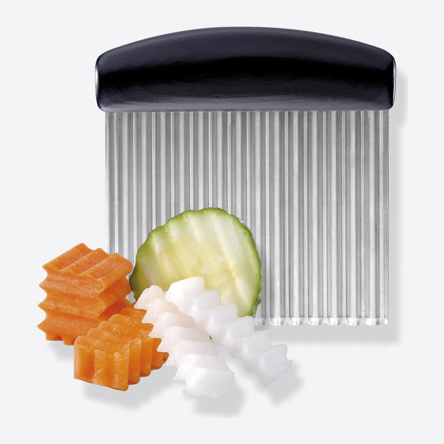 Mit dem triangle Wellenschneider lassen sich Scheiben, Stifte oder Würfel in Zickzack-Optik herstellen. Geeignet sind Möhren, Gurken, Radiesschen und Kohlrabi ebenso wie Äpfel, Melonen oder Papaya. Selbstgemachte Pommes Frittes oder Butterecken sind mit diesem Werkzeug schnell und einfach hergestellt. Durch die Kraftführung von oben und die dünne Klinge gleitet der Wellenschneider einfach auch durch harte Gemüse und hinterlässt einen sehr sauberen, definierten Wellenschnitt.
