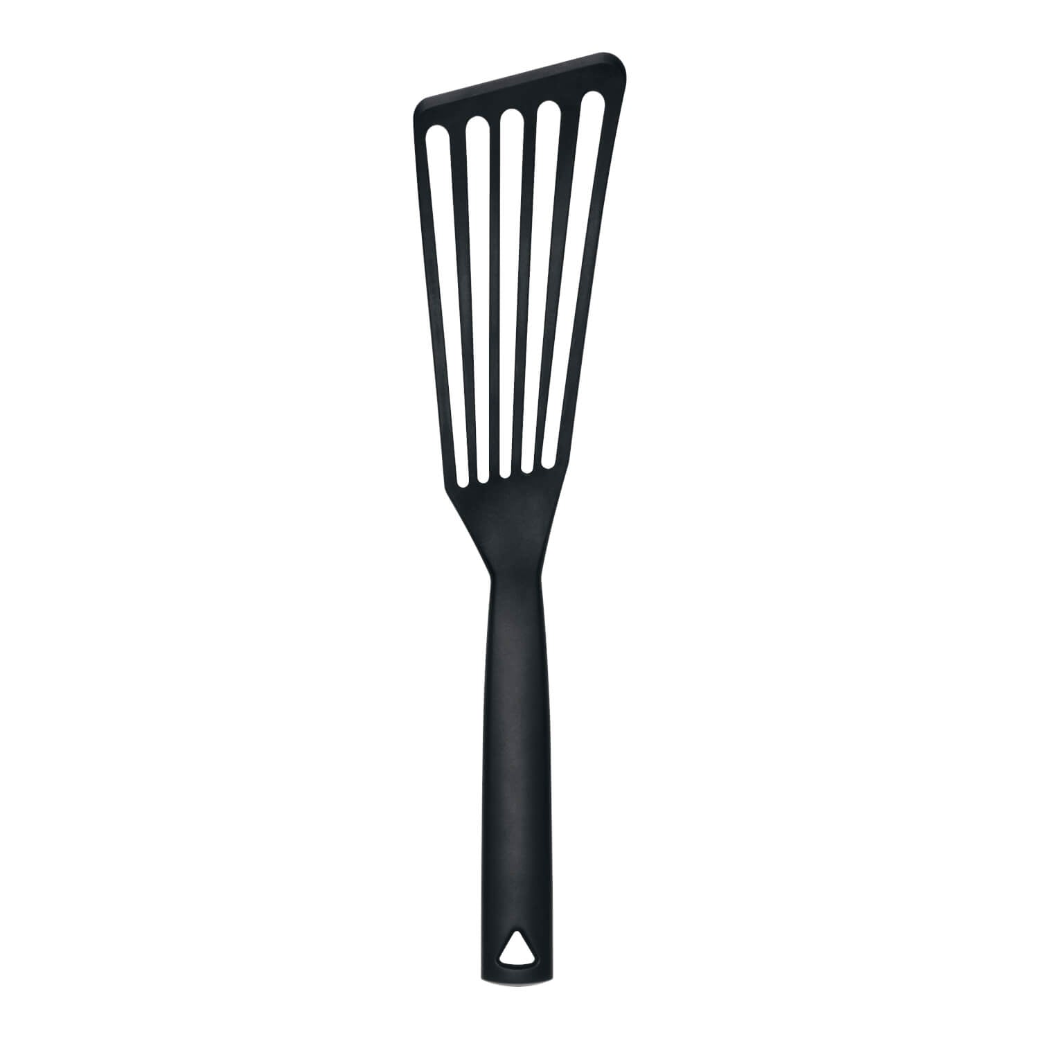 Das massive Griffdesign mit Aushängeloch liegt fest und bequem in der Hand. Eine kleine Nut auf der Rückseite des Griffes verhindert, dass der Wender in Schüsseln oder Pfanne rutschen kann.