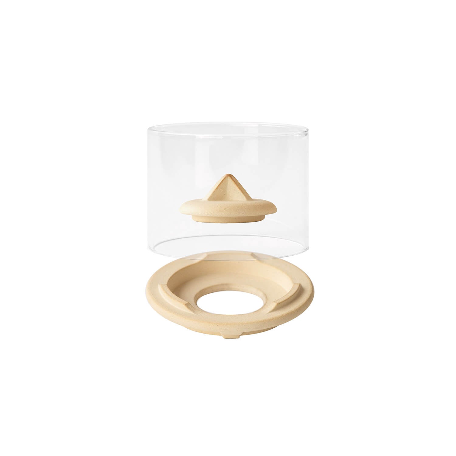 Der Windglas-Aufsatz besteht aus drei Teilen: Aufsatzring, Glashaube und Löschdeckel.