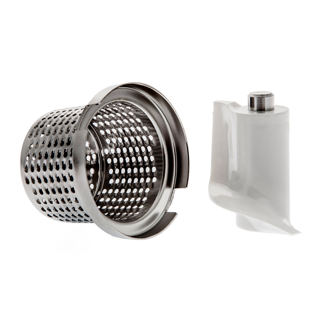 Reibevorsatz zur Montage an dem Fleischwolf. Der Reibevorsatz besteht aus einem Reibezylinder und einer Reibeschnecke. So kann man schnell und unkompliziert Nüsse, Schokolade, Hartkäse usw. zu feinem Material reiben.