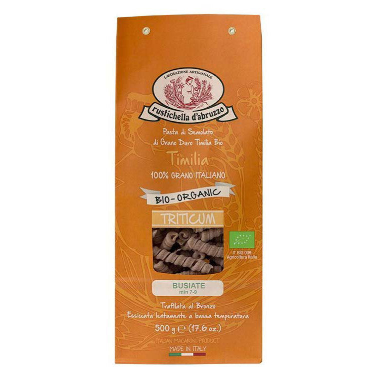 Symbol der sizilianischen kulinarischen Tradition, Busiate sind eine Form von Pasta in Form von dünnen Tuben, die auf sich selbst gedreht werden, eine Art Makkaroni. Der Name der Pasta soll vom "Buso" stammen, einem speziellen Strickbügel, der üblicherweise für die Verarbeitung von Stoffen wie Wolle und Baumwolle verwendet wurde. Aber der Begriff könnte sich auch auf die Busa oder "Dysa" beziehen, ein für das Mittelmeer typisches Gras, mit dem die Bauern in der Antike die Ährenbündel banden. Die Geschäfte von Rustichella dAbruzzo werden mit der Timilia hergestellt, einer der Sorten von altem Weizen, die Rustichella wiedererlangen will. Sie können mit Tomatensauce und Fischsoßen serviert werden.