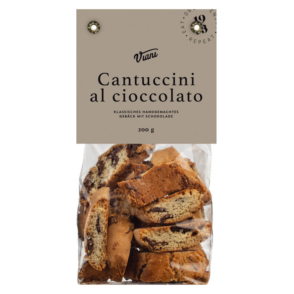 Der authentische Geschmack der Toskana mit den Cantuccini al cioccolato von Viani. Diese knusprigen toskanischen Biscotti sind mit zartbitteren Schokoladenstückchen verfeinert. Perfekt zu einem Cappuccino oder einem leichten Rotwein - ein köstlicher Genussmoment.