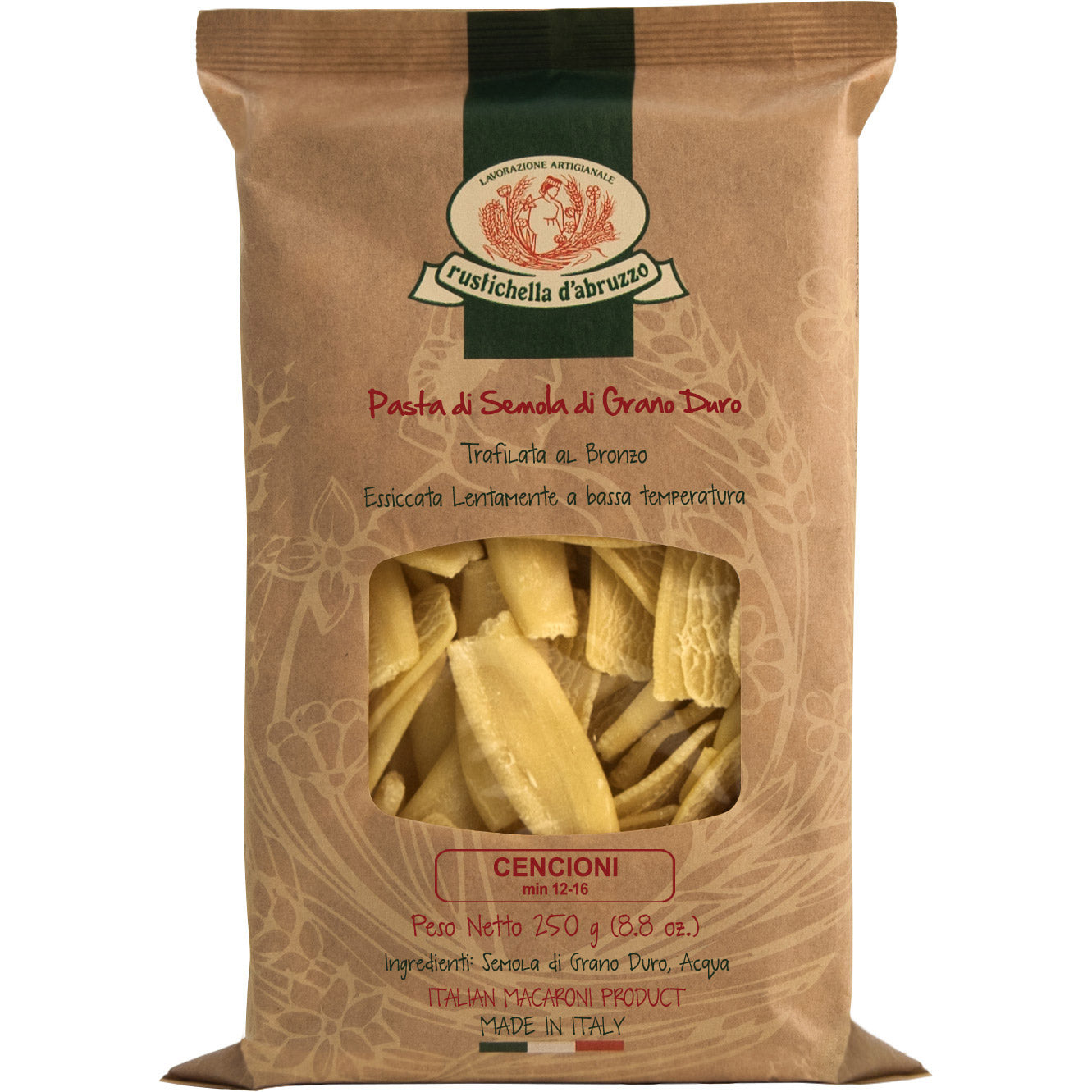 Diese in Mittel- und Süditalien beheimatete, handwerklich hergestellte Pasta mit ihrer ovalen und leicht gewellten Form wird in verschiedenen traditionellen Rezepten verwendet. In Siena zum Beispiel werden während des Palio Cencioni Rustichella dAbruzzo auf einem Fondue aus Schafskäse, Kirschtomaten und Rucola für den Sieger zubereitet. Zu den mediterranen Varianten gehören Tomaten, Sardellen, Kapern und gesalzener Ricotta oder Ricotta aus Schafsmilch, kalabrische Wurst, Tomatenpüree und Tropea-Zwiebeln. Für Liebhaber einfacher Geschmacksrichtungen empfehlen wir die Kombination mit der biologisch angebauten Tomaten-Basilikum-Sauce von Rustichella dAbruzzo. Die Kochzeit beträgt 14-16 Minuten.