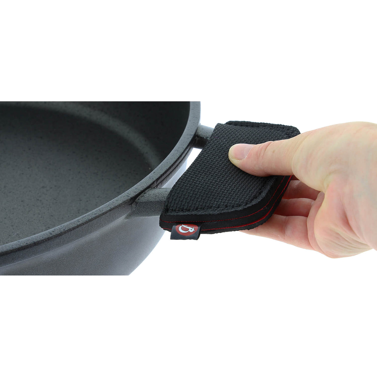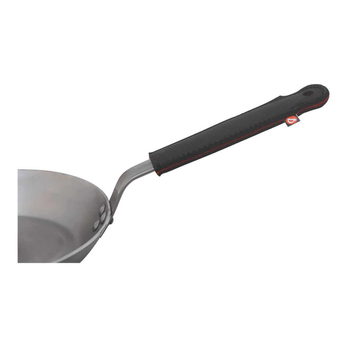 Griffschutz Der Stahl ist ein guter Wärmeleiter, und die Griffe, die ebenfalls aus Stahl sind, können einen Teil der Wärme akkumulieren. Dieser thermische Griffhalter aus Neopren passt perfekt zum flachen De Buyer-Griff, ermöglicht eine sichere Handhabung und vermeidet Verbrennungen.