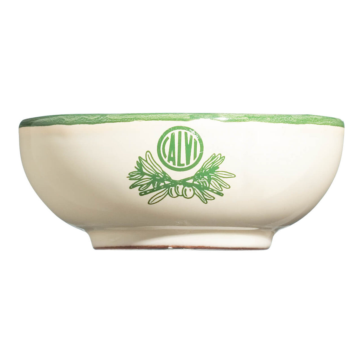 Kleine Schälchen aus Ton, handbemalt mit Calvi-Logo. Ideal zum Eintunken von rohem Gemüse in einem Dip aus Öl, Essig und Salz (pinzimonio), aber auch für Olivenöl-Degustationen, Oliven, Antipasti oder Saucen geeignet.
