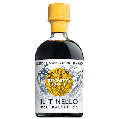 Familie Crotti produziert seit über 40 Jahren Balsamessige auf höchstem Niveau. Ihr jüngster, der gelbe Tinello, reifte circa ein Jahr im Fass. Der bernsteinfarbene Balsamessig aus eingekochtem Traubenmost und hochwertigem Weinessig besitzt eine gut eingebundene Säure, leichte Röstnoten und schmeckt dabei sauber und harmonisch. Auch das Holzfass ist ganz fein nachvollziehbar. Er eignet sich sehr gut für Rohkost, in Vinaigrettes und Dips.