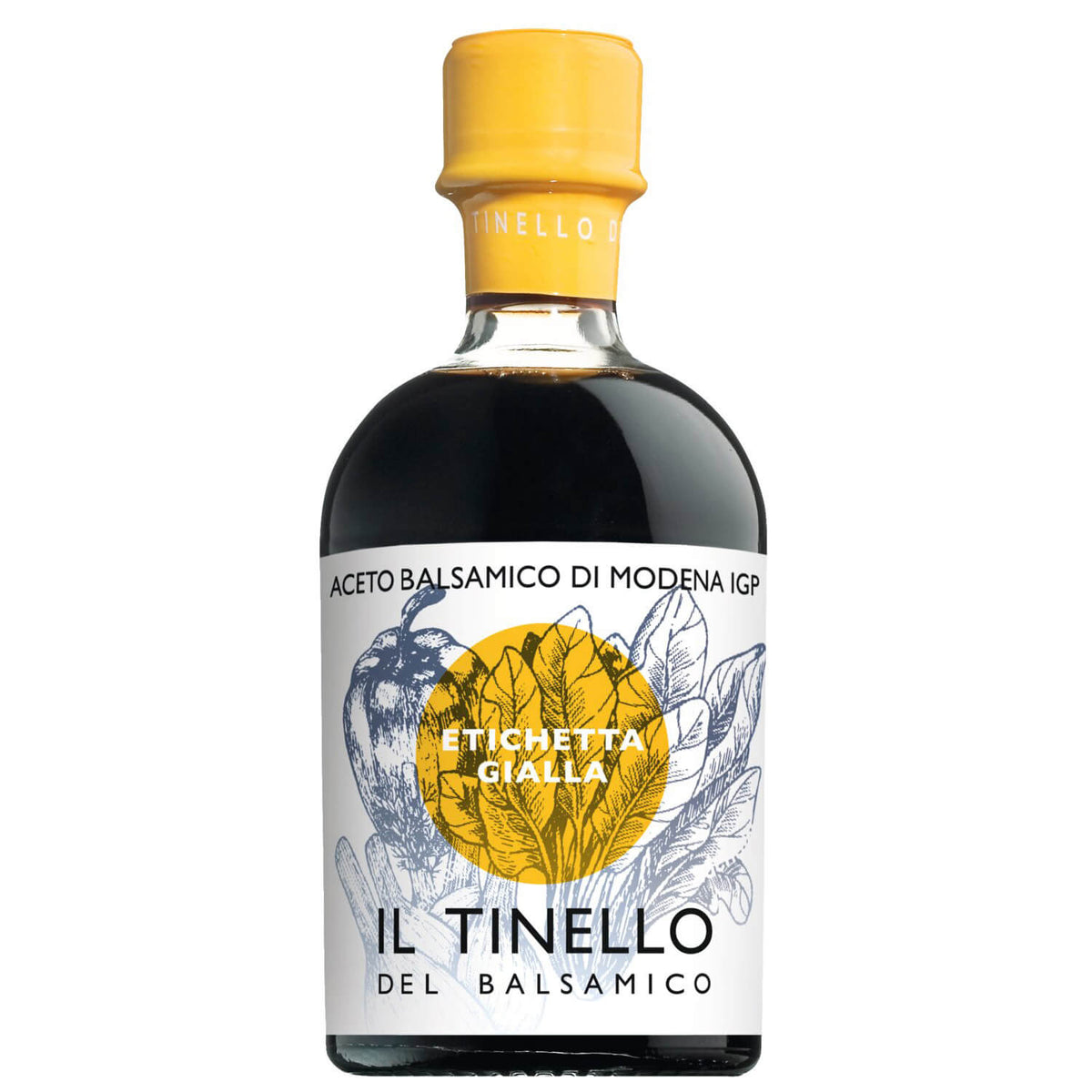 Familie Crotti produziert seit über 40 Jahren Balsamessige auf höchstem Niveau. Ihr jüngster, der gelbe Tinello, reifte circa ein Jahr im Fass. Der bernsteinfarbene Balsamessig aus eingekochtem Traubenmost und hochwertigem Weinessig besitzt eine gut eingebundene Säure, leichte Röstnoten und schmeckt dabei sauber und harmonisch. Auch das Holzfass ist ganz fein nachvollziehbar. Er eignet sich sehr gut für Rohkost, in Vinaigrettes und Dips.