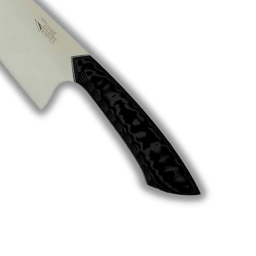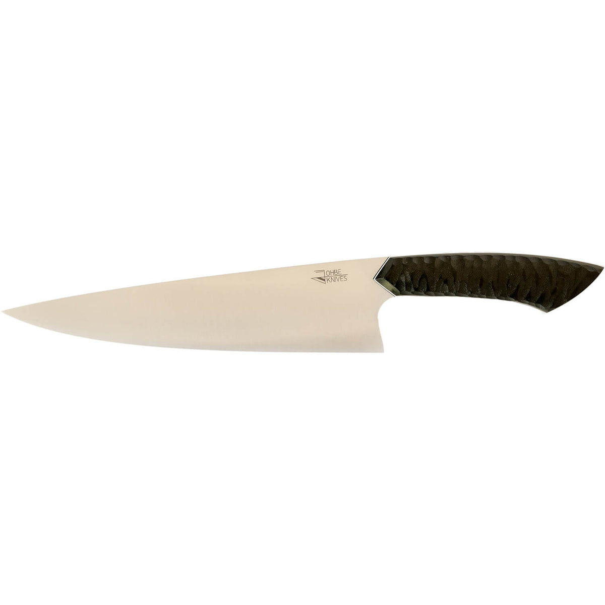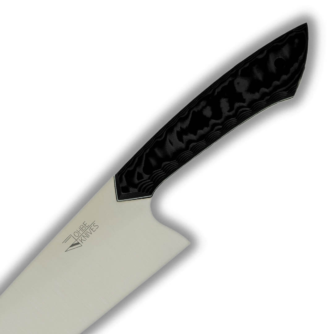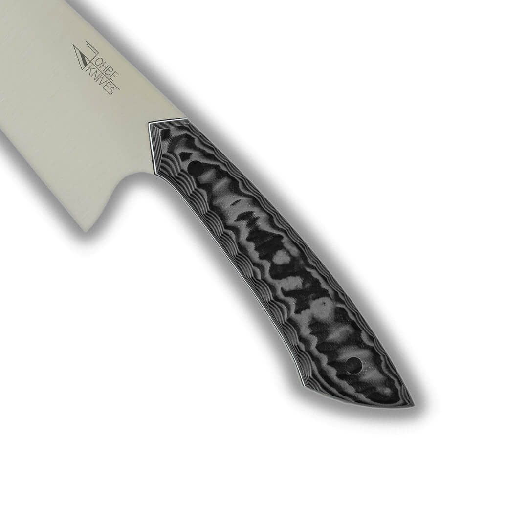 Das Kochmesser von JOHBE KnivesErleben Sie das RAW-Edition Kochmesser von JOHBE Knives – ein Meisterwerk deutscher Handwerkskunst, das Ihre Küche revolutionieren wird. Dieses handgefertigte Serienmesser verbindet zeitloses Design mit kompromissloser Qualität. Die Klinge aus rostfreiem 14C28N-Stahl bietet eine beeindruckende Härte von ca. 61HRC und bleibt außergewöhnlich lange scharf. Das satinierte Finish sorgt nicht nur für eine edle Optik, sondern auch für minimale Reibung beim Schneiden. Der ergonomisch geformte Griff aus G10 oder Olivenholz liegt perfekt in der Hand und bietet sicheren Halt, selbst bei intensiver Nutzung.