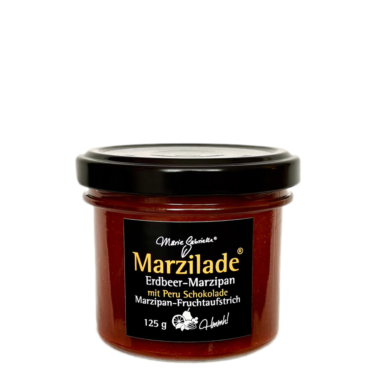 Marzilade® Erdbeere mit Peru-Schokolade im 125 g Glas überzeugt durch den kräftigen aromatischen Geschmack der Erdbeeren. Der Marzipananteil ist bewußt geringer gehalten um der Frucht und der Schokolade den vollen Raum zu geben. Zeitversetzt kommt der Geschmack des Marzipans zum Tragen.
