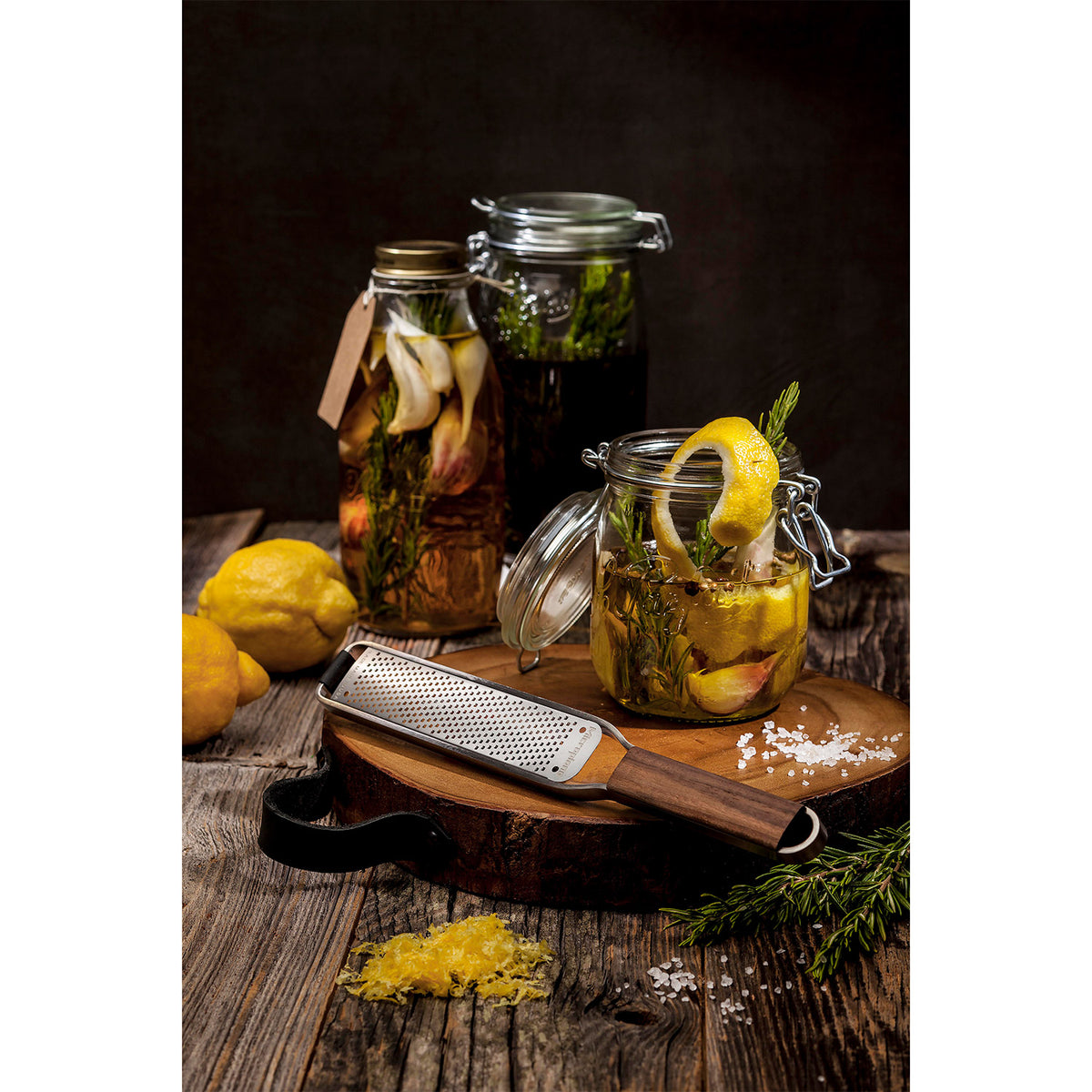 Die Kombination aus dem Griff, einem robusten Edelstahlrahmen und den rasiermesserscharfen, photo- geätzten Edelstahlklingen – made in USA – ermöglicht jederzeit optimale Reibergebnisse und sind der neue Status quo unter den Reiben. Mit der Zesterklinge, dem Original, reiben Sie Hartkäse, Ingwer, Knoblauch, Gewürze, Schokolade, Trüffel, Nüsse uvm. und zesten Zitrusschalen ganz fein im Handumdrehen und ohne jeglichen Kraftaufwand. Durch die Schärfe der Reiben werden die Lebensmittel präzise geschnitten und nicht zerrissen. Aroma entfaltet sich und der Geschmack wird verstärkt.