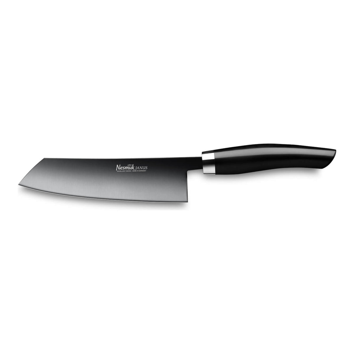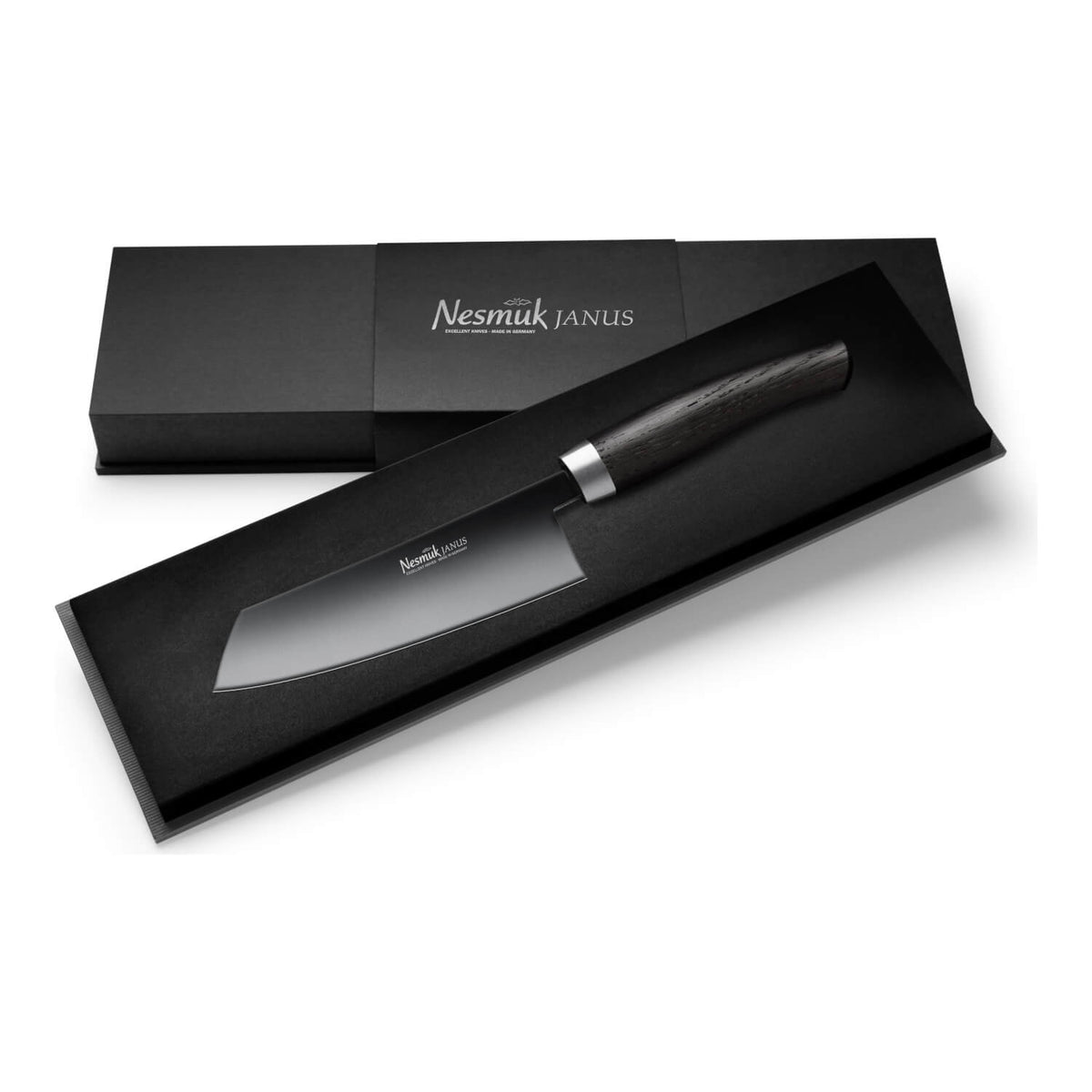Nesmuk JANUS mit Griff Karelische Maserbirke – unverkennbar an der schwarzen Klinge – wird aus einem Hochleistungsstahl mit Niobanteil gefertigt und mit einer hochwertigen Diamond-like-carbon Beschichtung (DLC) veredelt, die die funktionalen Eigenschaften der Klinge optimiert. Das Kochmesser mit einer 140 mm langen und 4 mm starken, einseitig hohlgeschliffenen Klinge ist der Allrounder, mit dem man rund 80 % aller Schneidaufgaben erledigen kann. Als „Basis-Messer“ in jeder Küche unverzichtbar und vielseitig einsetzbar.