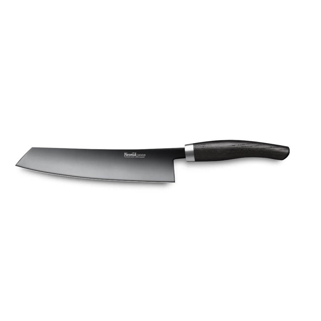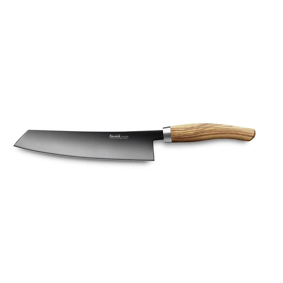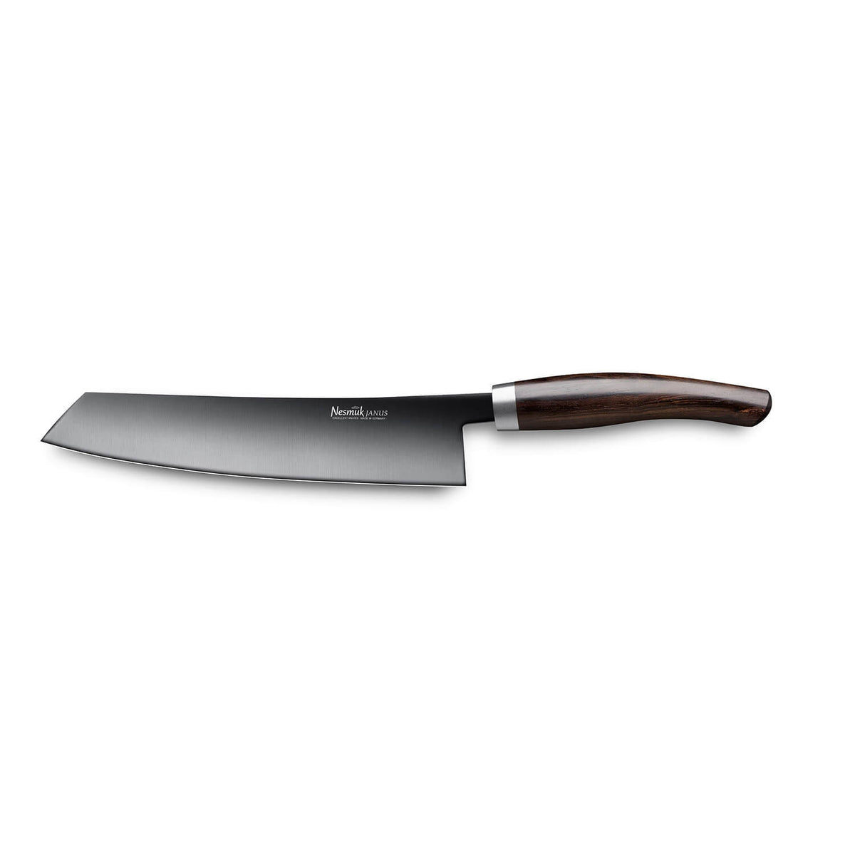 Nesmuk JANUS mit Griff karelische Maserbirke - unverkennbar an der schwarzen Klinge - wird aus einem Hochleistungsstahl mit Niobanteil gefertigt und mit einer hochwertigen Diamond-like-carbon Beschichtung (DLC) veredelt, die die funktionalen Eigenschaften der Klinge optimiert. Das Kochmesser mit einer 240 mm langen und 4 mm starken, einseitig hohlgeschliffenen Klinge ist der Allrounder, mit dem man rund 80 % aller Schneidaufgaben erledigen kann. Als „Basis-Messer“ in jeder Küche unverzichtbar und vielseitig einsetzbar.