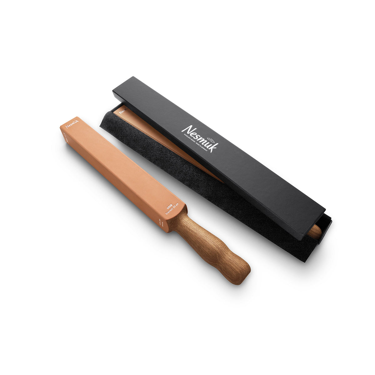 Auch die besten Messer verlieren mit der Zeit an Schärfe. Durch den Gebrauch entstehen Verrundungen sowie mikroskopische Ausbrüche an der Schneidkante - das Messer wird stumpf. Alle Nesmuk Messer werden aus hochfeinen Stahlsorten gefertigt, die eine extreme Schärfe ermöglichen. Herkömmliche Schärfmethoden wie Messerschärfgeräte und Wetzstäbe sind nicht geeignet, das volle Potenzial der exklusiv von Nesmuk verarbeiteten Stahlsorten auszuschöpfen. Dafür hat Nesmuk Streichriemen entwickelt, die optimal auf die Besonderheiten der Nesmuk Messer abgestimmt sind.
