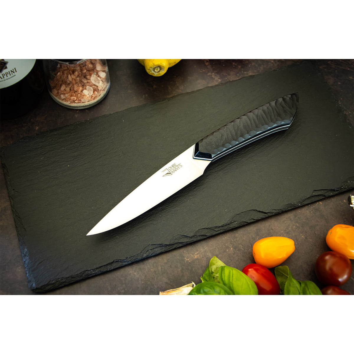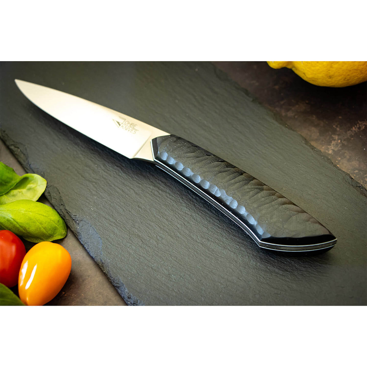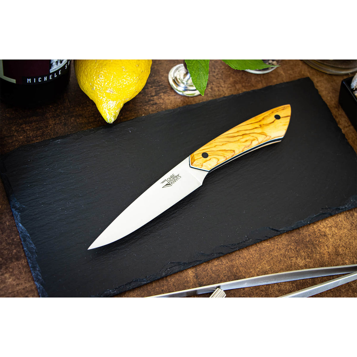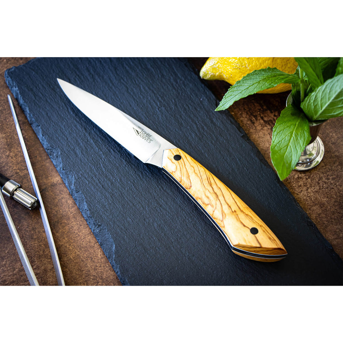 Der Griff aus sorgfältig ausgewähltem Olivenholz oder robustem G10 liegt perfekt in der Hand, bietet einen sicheren Halt und unterstreicht das elegante, zeitlose Design. Die durchdachte Balance des Messers sorgt dafür, dass auch anspruchsvolle Schneidarbeiten mühelos von der Hand gehen. Mit einem Gewicht von nur 121 g (Olivenholz) bzw. 130 g (G10) und einer Klingenlänge von 11,5 cm ist dieses Officemesser der ideale Begleiter für präzise Schnitte, feine Schälarbeiten und kreative Küchenkunst.