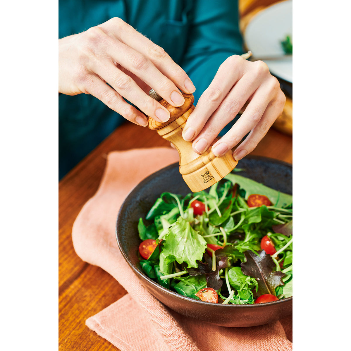 Das Modell Bistro ist eine Hommage an die erste Pfeffermühle von Peugeot aus dem Jahr 1874. Diese Version aus Olivenholz verleiht der 10 cm großen Salzmühle Bistro einen starken Charakter und natürliche Eleganz.