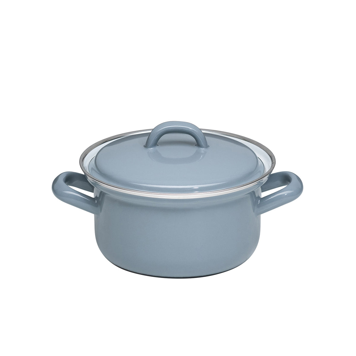 Die klassische Form der Emaille Kasserolle mit Deckel 16 cm hat eine gerade Form und die klassischen Emaillegriffe. Der Topf ist in der Farbe grau und besitzt eine maximale Füllmenge von 1 Liter.