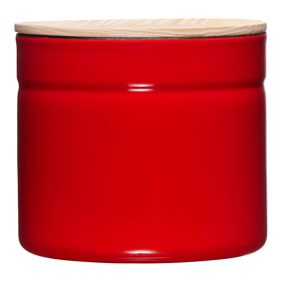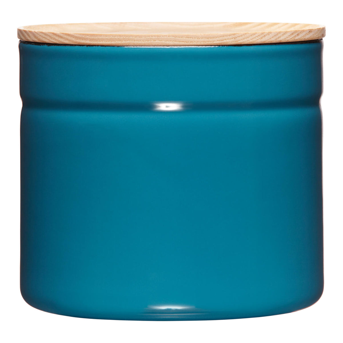 Die Dosen sind aus Emaille und der Deckel aus hochwertigem Eschenholz.