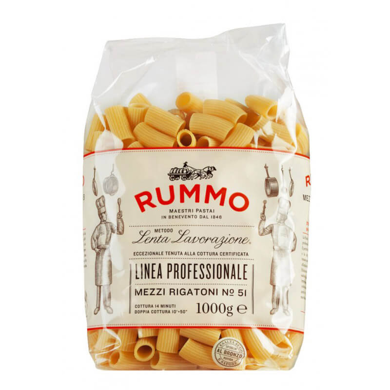 Genießen Sie die delikaten Rummo Mezzi Rigatoni N° 51 - perfekt für dichte Saucen wie Meeresfrüchte und Bohnen oder cremige Artischockensauce. Mit einer Kochzeit von 14 Minuten bieten diese Hartweizennudeln ein authentisches Stück italienischer Küche.