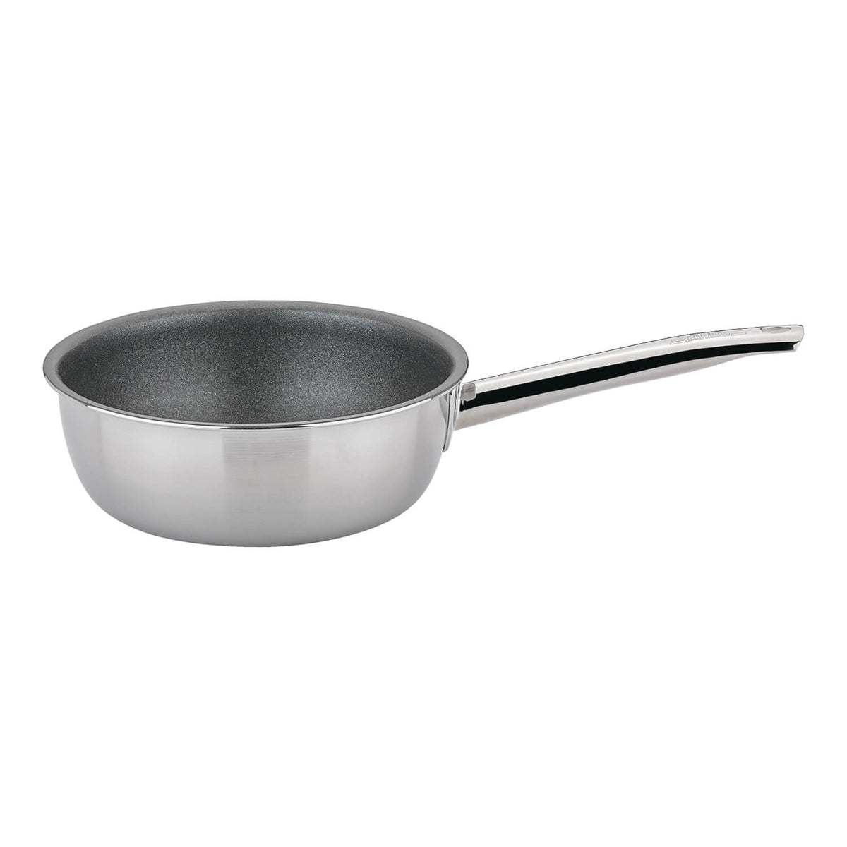 Das spezielle 5-Lagen-Mehrschicht-Material leitet die Wärme schnell und gleichmäßig weiter – für ein perfektes Ergebnis. Dank der 3-fach-Antihaftwirkung gleiten Ihre Speisen mühelos auf den Teller. Der ergonomische, wasserdichte Stiel ist fest mit dem Pfannenkörper verbunden, der geschlossene Rand schützt die Sauteuse vor Korrosion. Das robuste Kochgeschirr ist hitzebeständig bis 250°C.