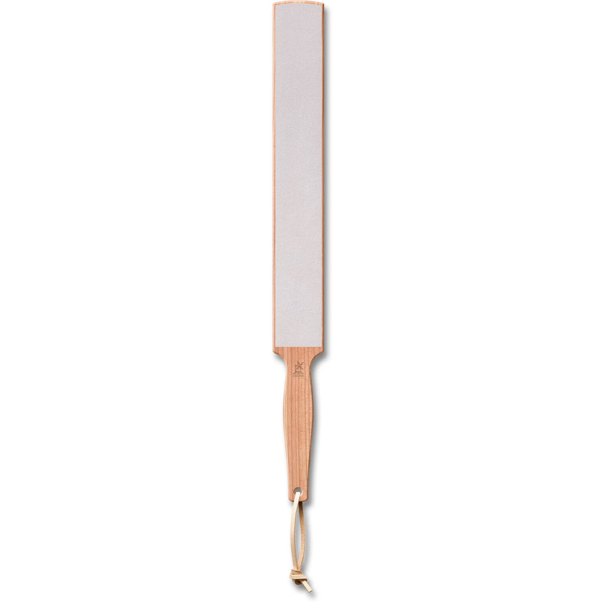 Der Streichriemen dient zum feinen Entgraten und Polierschärfen der Schneide nach dem Steinschliff. Das Abziehen der Schneide erhöht die hochfeine Schärfe nochmals um ein Vielfaches. Der Streichriemen wird bei uns in Solingen gefertigt. Sein Korpus besteht aus gedämpftem und geöltem Kirschholz von deutschen und österreichischen Obsthöfen.